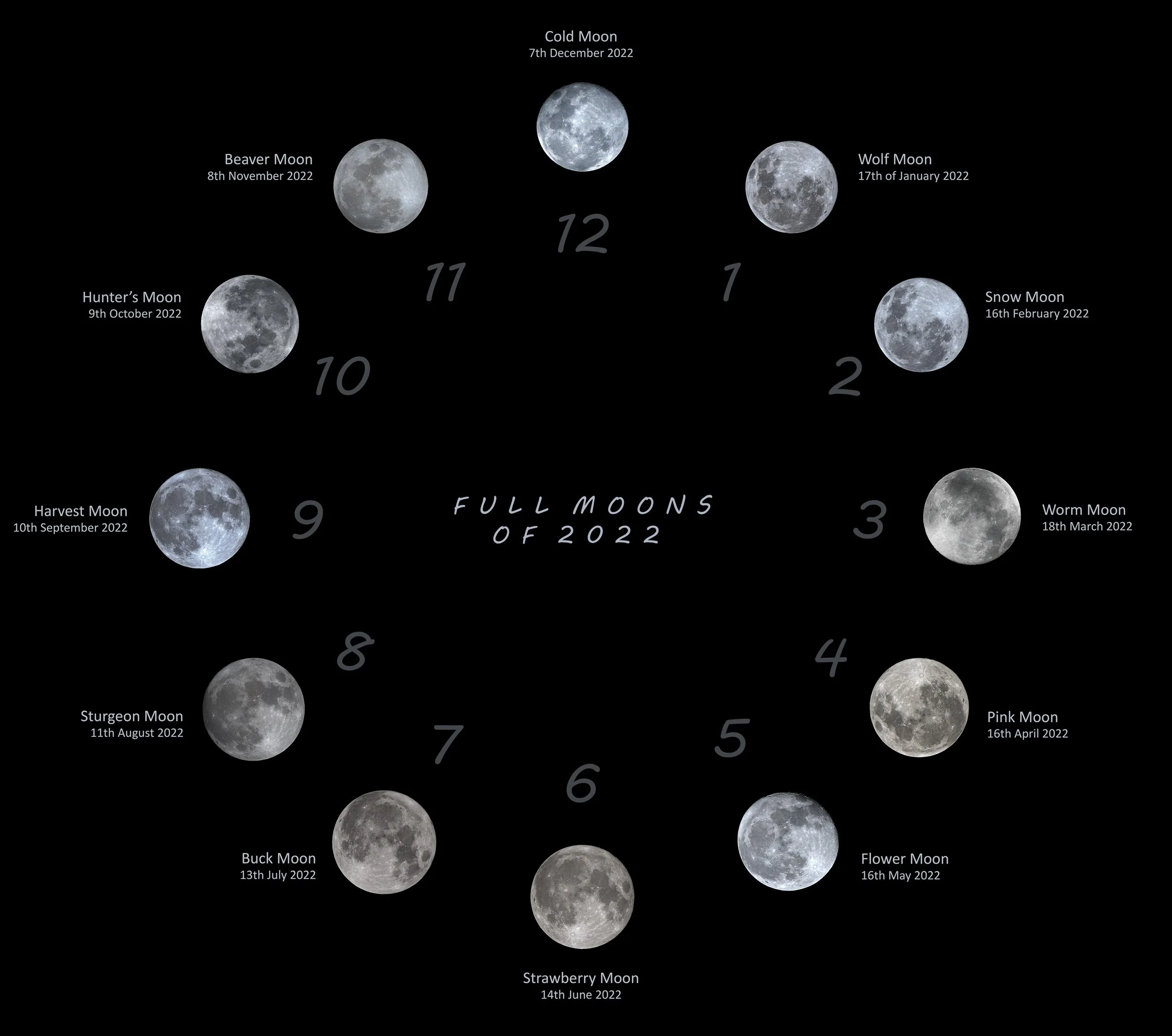 Image Description and Details : The first Full Moon of 2023 is in the sky tonight opposite the Sun at 23:08 UTC. Big and beautiful, the Moon at its brightest phase should be easy to spot. Still, for quick reference images captured near the times of all the full moons of 2022 are arranged in this dedicated astro-imaging project from Sri Lanka, planet Earth. The day, month, and a traditional popular name for 2022's twelve full moons are given in the chart. The apparent size of each full moon depends on how close the full lunar phase is to perigee or apogee, the closest or farthest point in the Moon's elliptical orbit. Like the 2022 Wolf Moon at the 1 o'clock position, tonight's Full Moon occurs within a about two days of apogee. But unlike in 2022, the year 2023 will have 13 full moons that won't all fit nicely on the twelve hour clock.