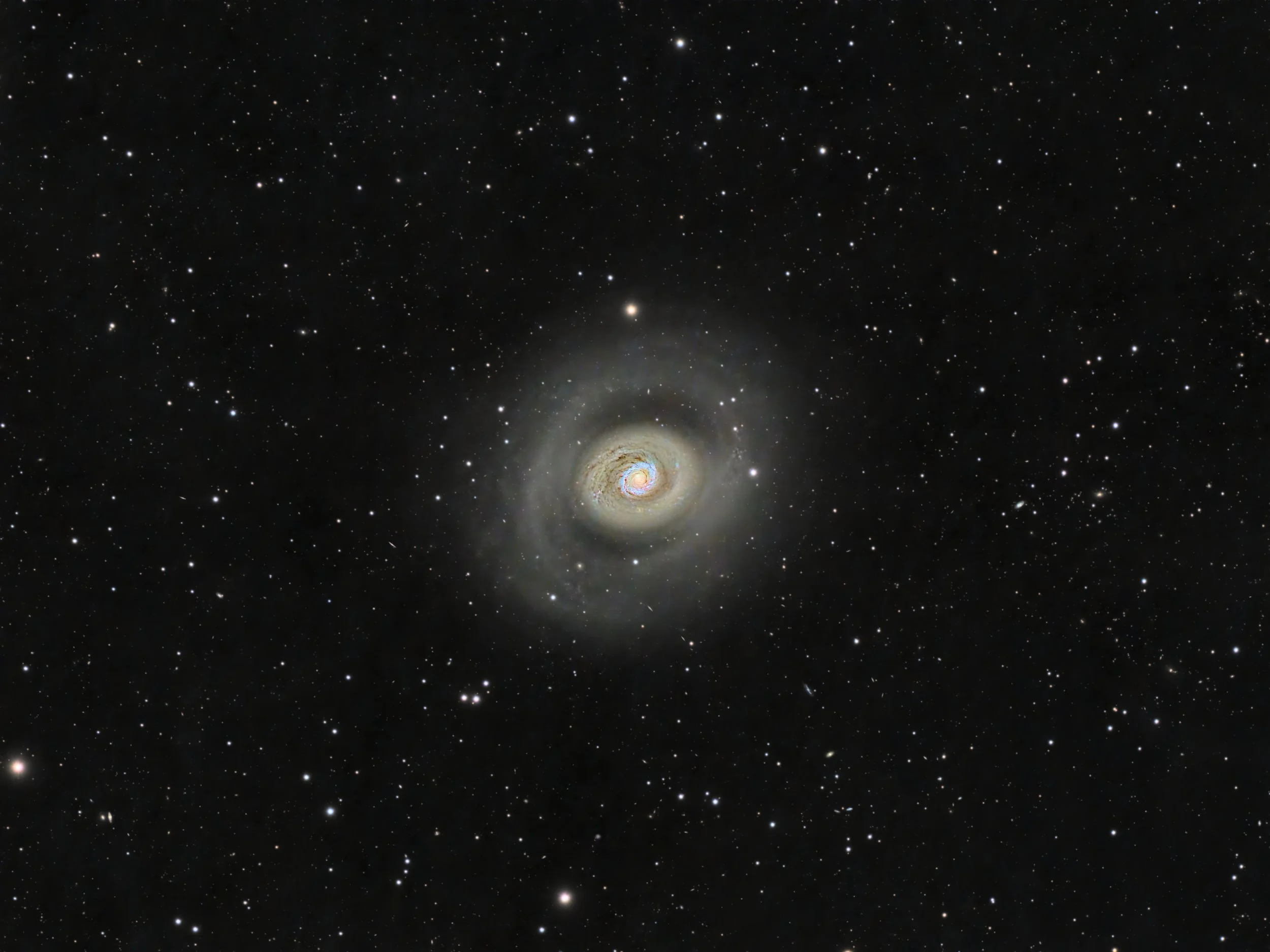 Image Description: Messier 94 (M94) is a spiral galaxy located in the constellation Canes Venatici. It’s about 16 million light years from us and has two rings. The inner ring structure is about 5,400 light years wide, and the outer ring is about 45,000 light years across. The outer ring contains more than 20% of the galaxy’s mass. There is a lot of star formation occurring occurring in this galaxy, particularly in the central region. There are numerous other little galaxies in the image, but I didn’t find any of them in the catalogues that I had readily available.