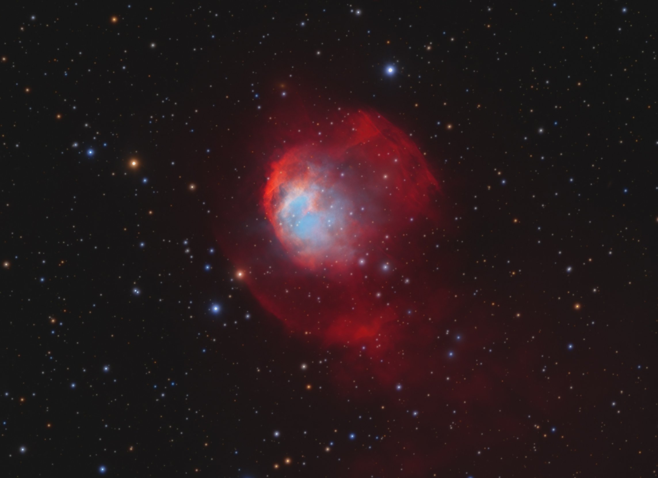 Gently, the blue OIII core breaks through the red cocoon of ionised hydrogen (H-alpha).
