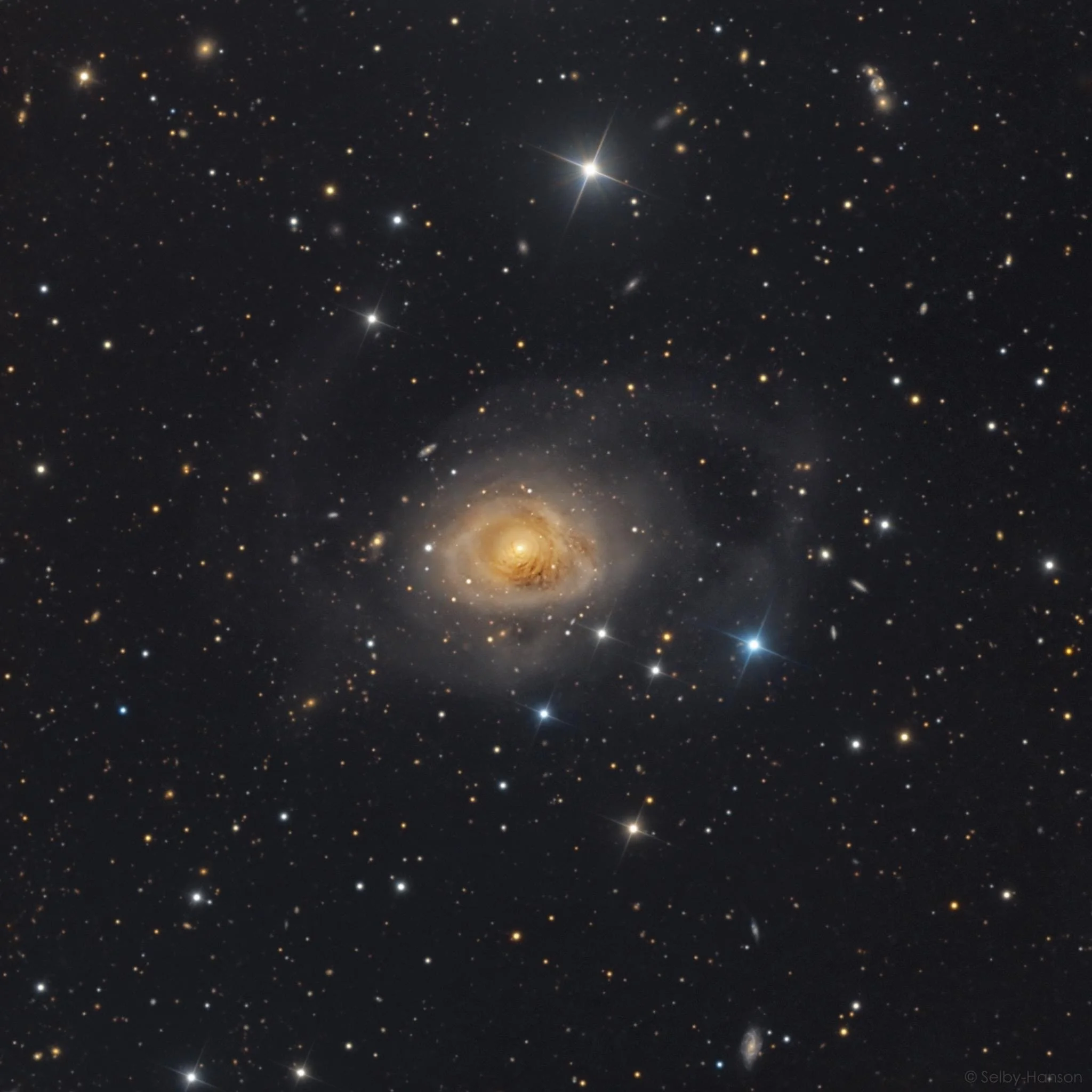 NGC 7377 is located 100 million light years away in Aquarius. It is relatively small in the apparent field of view and has been very rarely imaged. It has been variously classified as lenticular and spiral. As seen in this image there is a spiral structure evident and faint out stretched arms. It is more probable that this is a spiral transitioning to a lenticular galaxy. The spiral structure has a heavy dust content and is quite dense towards the central portion of the galaxy. The overall shape of the galaxy indicates possible past interaction with another galaxy. Imaged in LRGB on our Planewave CDK 1000 at Observatorio El Sauce, Chile.