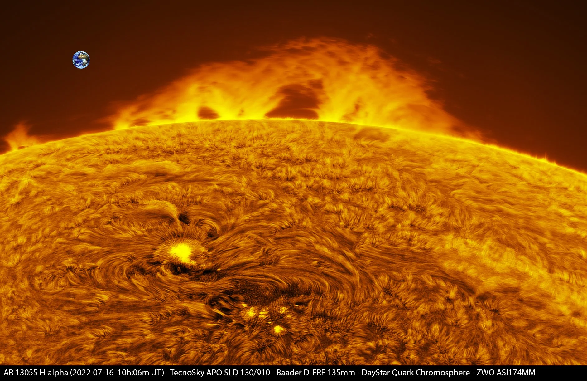 Image Description and Details : Huge solar prominence; the active region 13055 is visible on the disk. The image of the Earth was inserted for comparison. Setup: Tecnosky APO SLD 130/910, Baader D-ERF 135mm, DayStar Quark Chromosphere and ZWO ASI174MM camera.