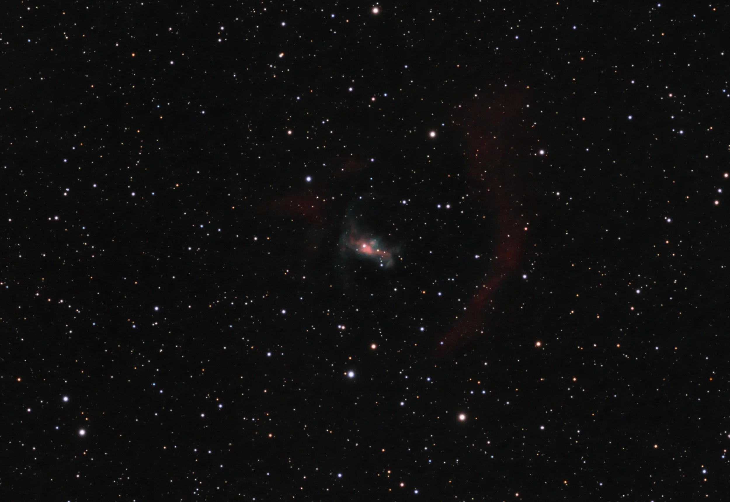 Image Description and Details : Here is a planetary nebula you probably never heard of. Kronberger 131 (Kn131), also known as PN G162.9-01.6 is a mysterious and unusually shaped planetary nebula in the constellation Auriga. Kn 131 is a small and very faint bipolar planetary nebula about 4x3 arc min in size. It has faint wing like appendages on each end and contains HII and OIII emission. Exposed in RGB one would not know something is even here. To the east and west of the nebula is a really faint area of HII emission. Kn131 is also cataloged as PN G162.9-01.6. Looking around the web one can not find any images of this object. This may be the first amateur image. The image is a full resolution crop of the area around the nebula. The image is a HOO image with RGB stars. The image resolution is .62 arcsec/pixel.