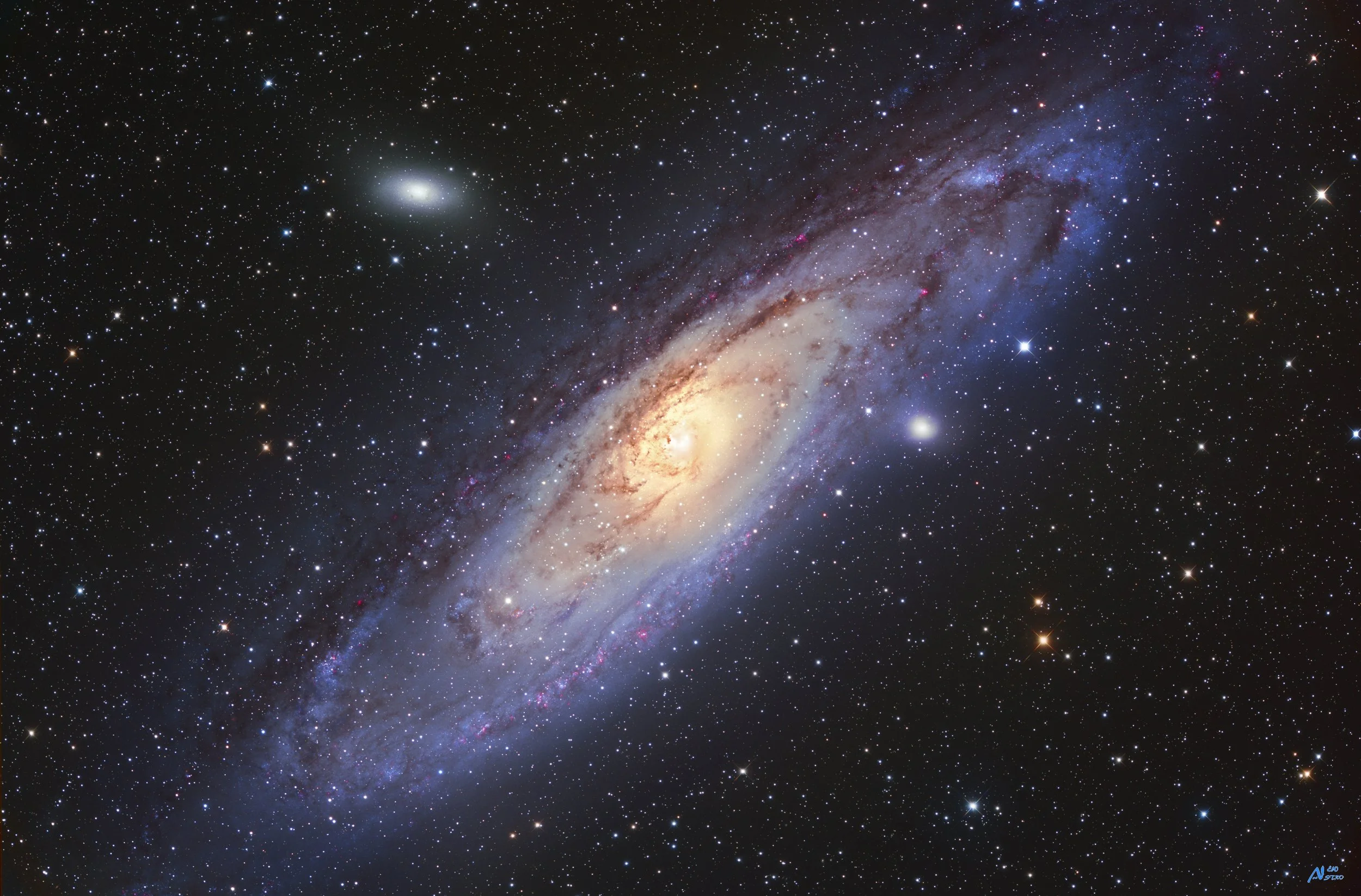 Consisting of 300 billion stars, the Andromeda galaxy M31 is considered the twin sister of our Galaxy. It is accompanied by two much smaller satellite galaxies, M32 and M110. The Andromeda Galaxy is the most distant object that can be seen without an instrument under good skies, at 2.5 million light years.