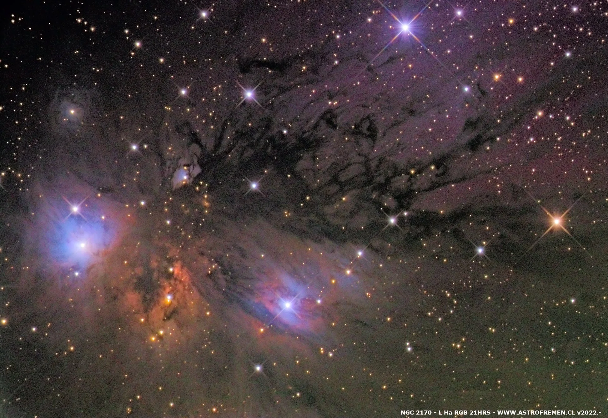 NGC 2170 nebular complex in Monoceros. L Ha RGB exposure for about 21 hours. Scope GSO RC 30 cms, camera Sbig STF8300-AO/8, from my backyard obs at La Colonia, Illapel, Chile. Suburban skies. All exposures at -35°C, all subframes 12 minutes except Ha (16 minutes each). MaxIm, CCDStack2, Photoshop softwares.