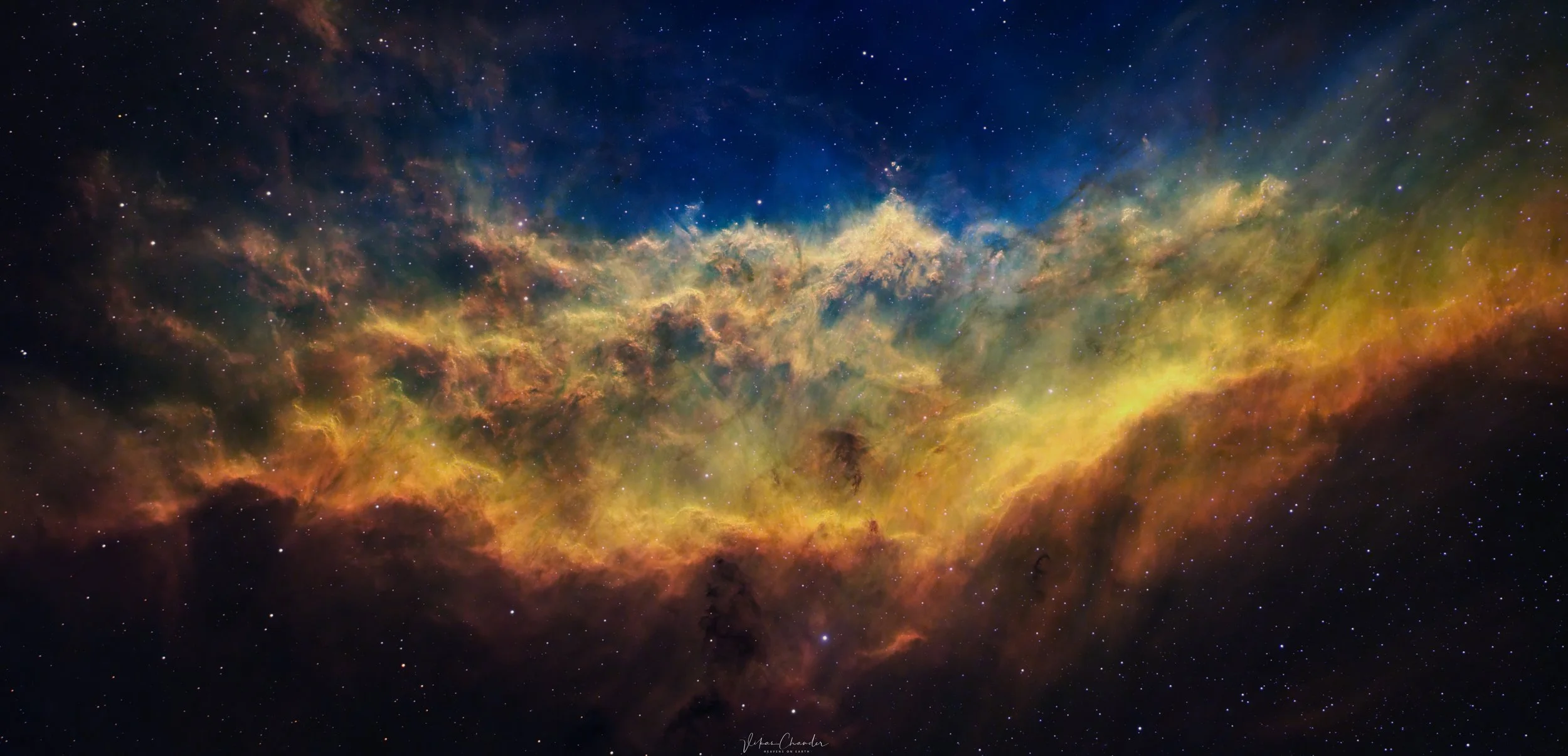 Image Description and Details : A favourite deep-sky target of astrophotographers is NGC 1499, the California Nebula. The California Nebula is found in the Orion Arm of our Milky Way galaxy, and has been given its informal nickname because its shape resembles the outline of the US state of California. It is a large emission nebula stretching across almost 2.5 degrees of the night sky in the constellation Perseus, with an apparent magnitude of 6.0 and lies approximately 1,000 light-years away. It is very well imaged in broadband filters as well as the narrowband Hubble palette seen here.