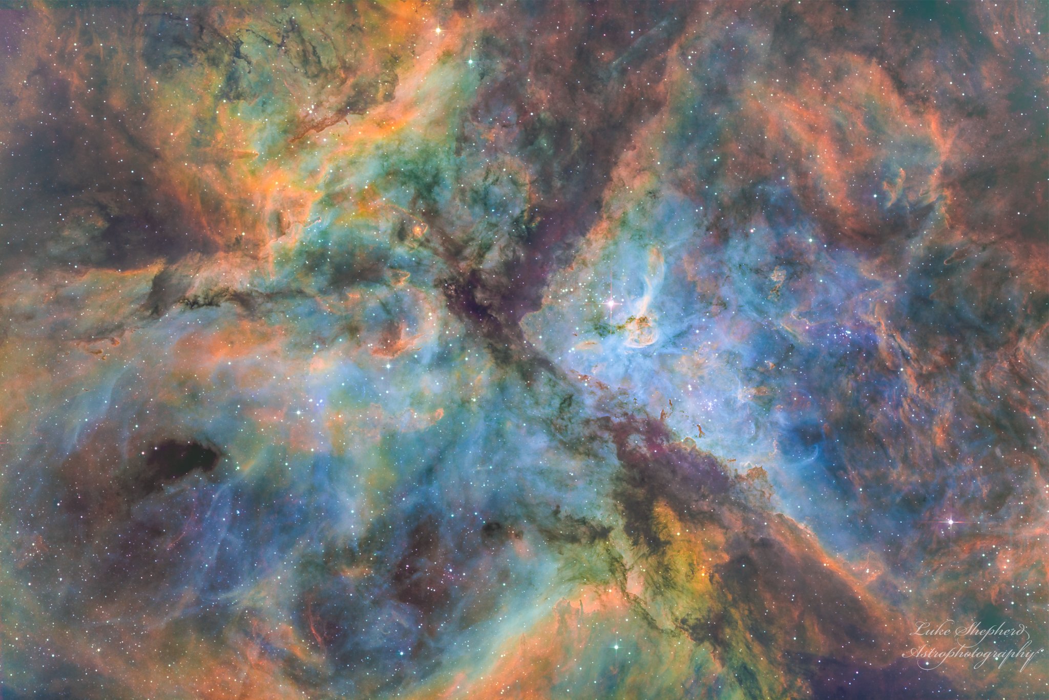 captured a little over 4hrs of data on The Carina Nebula also known as NGC3372 a massive bright nebula located in the constellation Carina. It’s one of the easiest to spot with the naked eye in a dark sky because it’s the size of 4 moons wide - making it a good target to look at through binoculars.