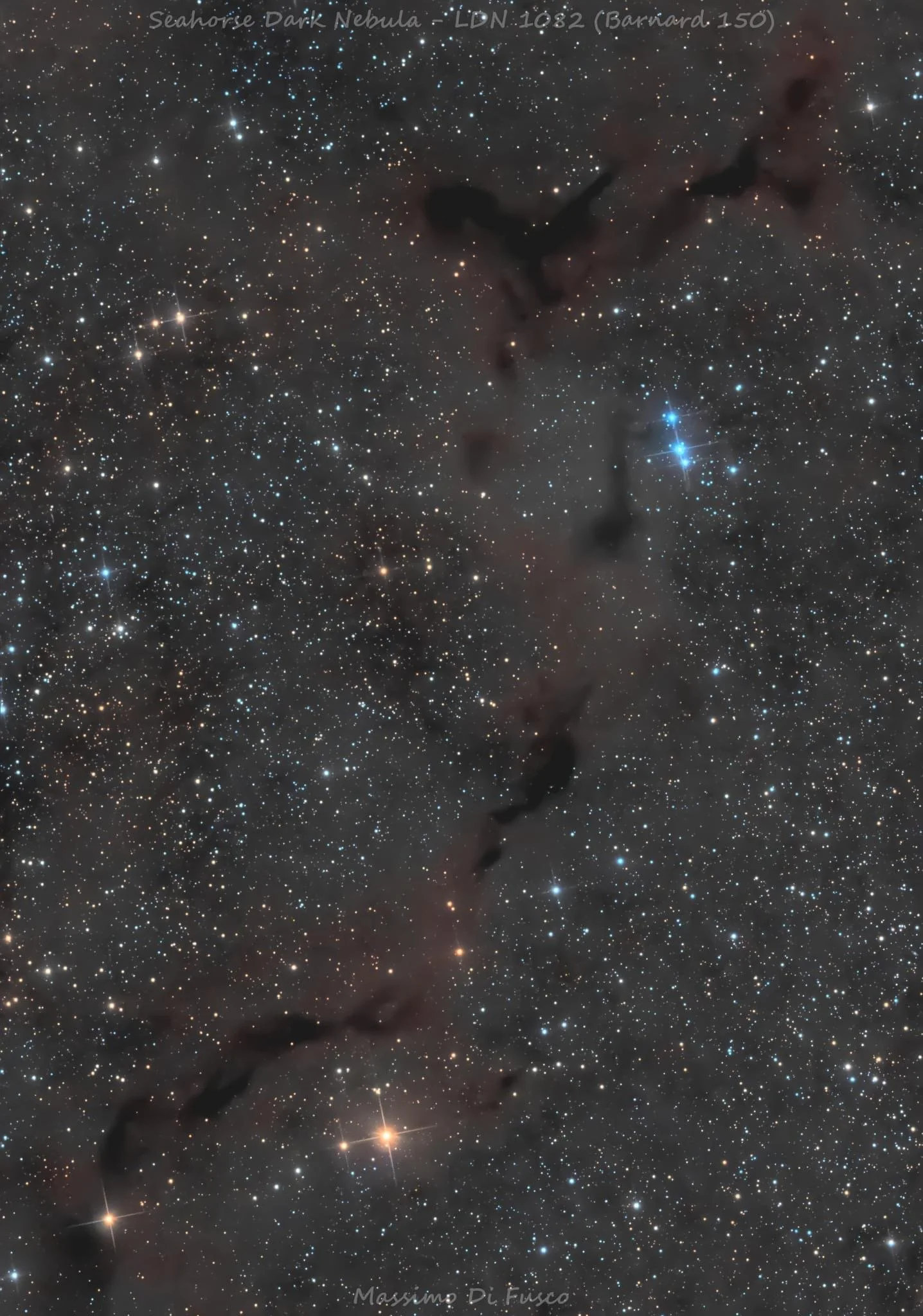 LDN 1082 or Barnard 150, also known as Seahorse Nebula because of its striking appearance, is an extended, elongated dark molecular cloud of dust in Cepheus constellation, so thick, that it absorbs all the light that comes from the stars behind it. This molecular cloud is part of our Milky Way galaxy, one of the 182 objects cataloged by astronomer Edward E. Barnard and it lies at about 1200 Llight -years away. Cloud location on the Milky Way's plane, makes it stand out on the background completely filled with colorful stars of any age and size.