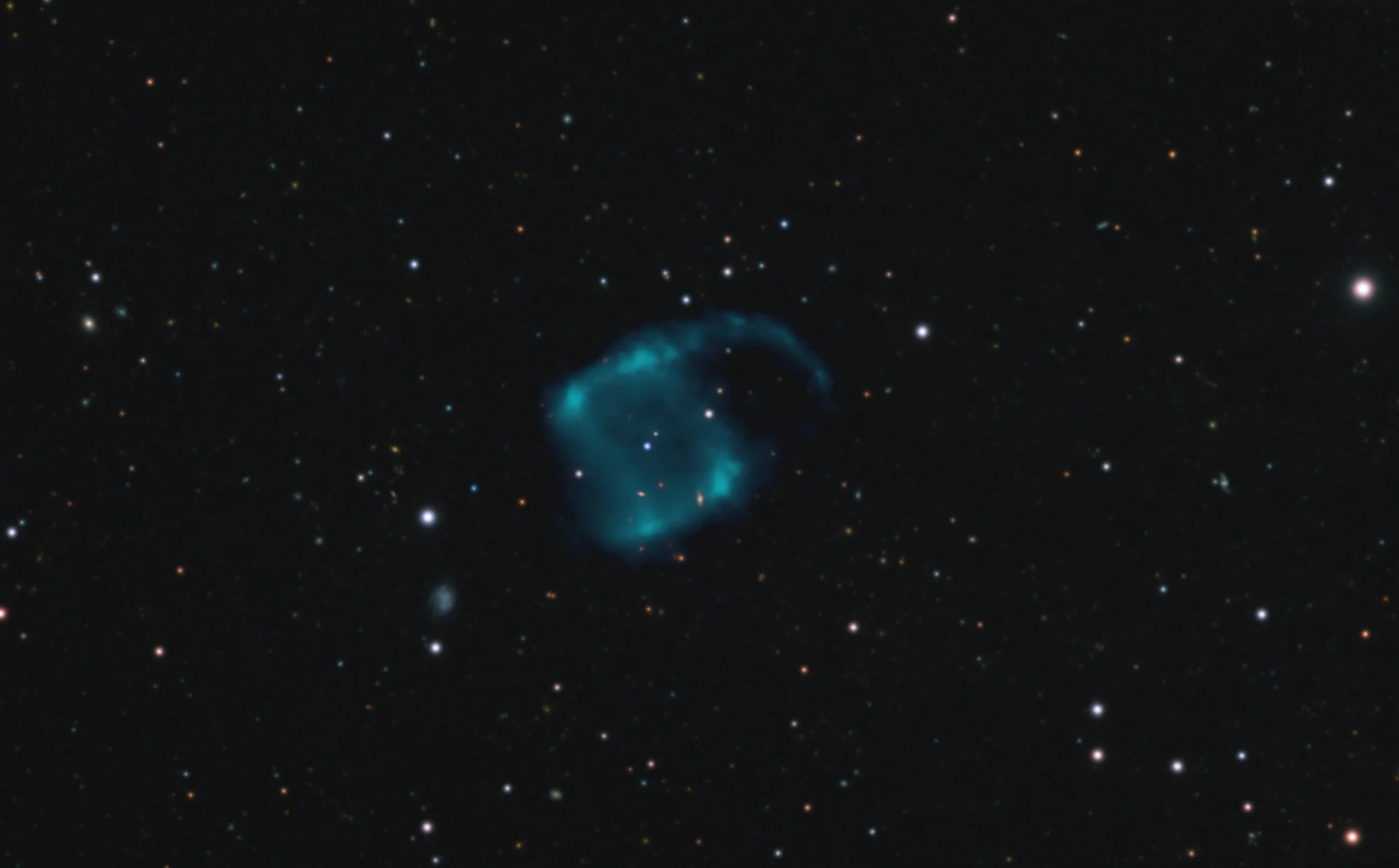 Image Description and Details : LTNF 1 is an extremely faint and rarely-imaged highly-evolved planetary nebula in the constellation Ursa Major. It is a high-excitation nebula with an eclipsing binary star system (BE Ursae Majoris) at its centre which has resulted in its unusual morphology. It is around 5,000 light years from Earth. It is so transparent that galaxies can be seen through it. It was discovered by James Liebert, Richard Tweedy, Ralf Napiwotzki and Michael Fulbright in 1995. A joint project with Sven Eklund.