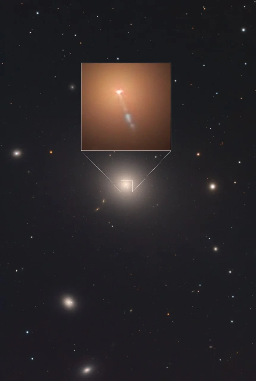Image Description and Details : The supermassive black hole powering M87's core has a mass about 6.5 billion times that of the Sun and generates two jets of plasma in opposite directions that span thousands of light-years. The jet oriented towards the Earth is visible and appears blue / light blue while the other is extremely weak and is not visible. The great luminosity and blue tint of the jet are due to the relativistic effect called "relativistic beaming" or "Doppler boosting" which occurs because particles oriented towards our line of sight are accelerated by the black hole up to 99% of the speed of light and simultaneously emit radiation.