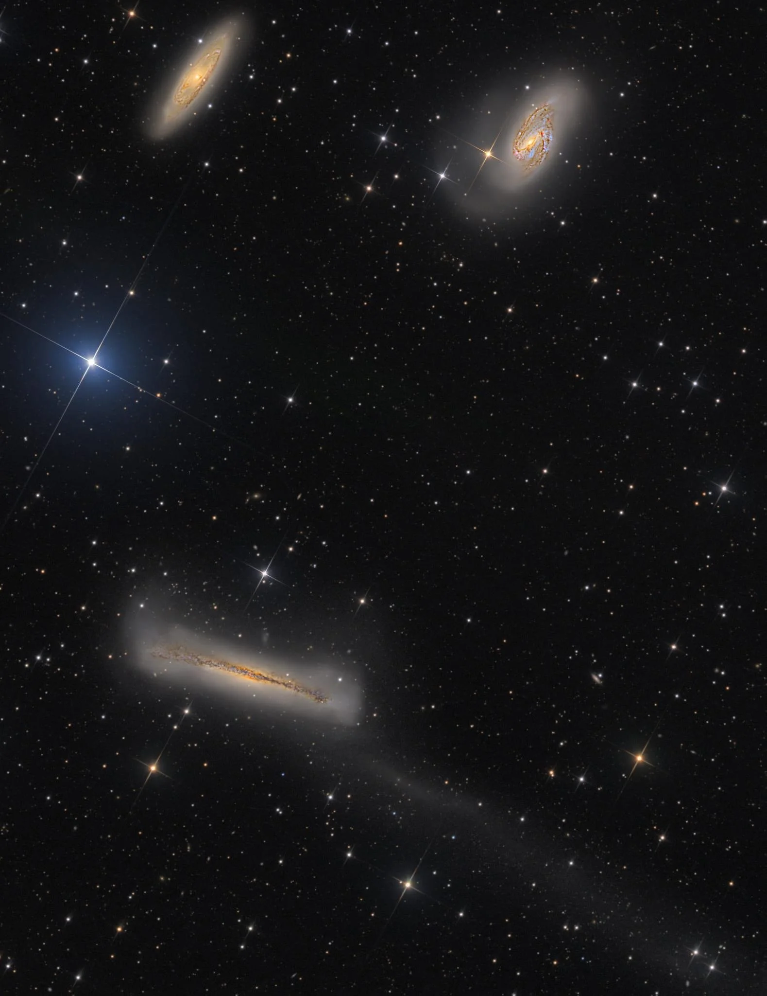 The Leo Triplet, or the M66 Group, is a group of interacting spiral galaxies located in the northern constellation leo. The group consists of the galaxies Messier65, Messier 66 and NGC 3628 also known as the Hamburger Galaxy.