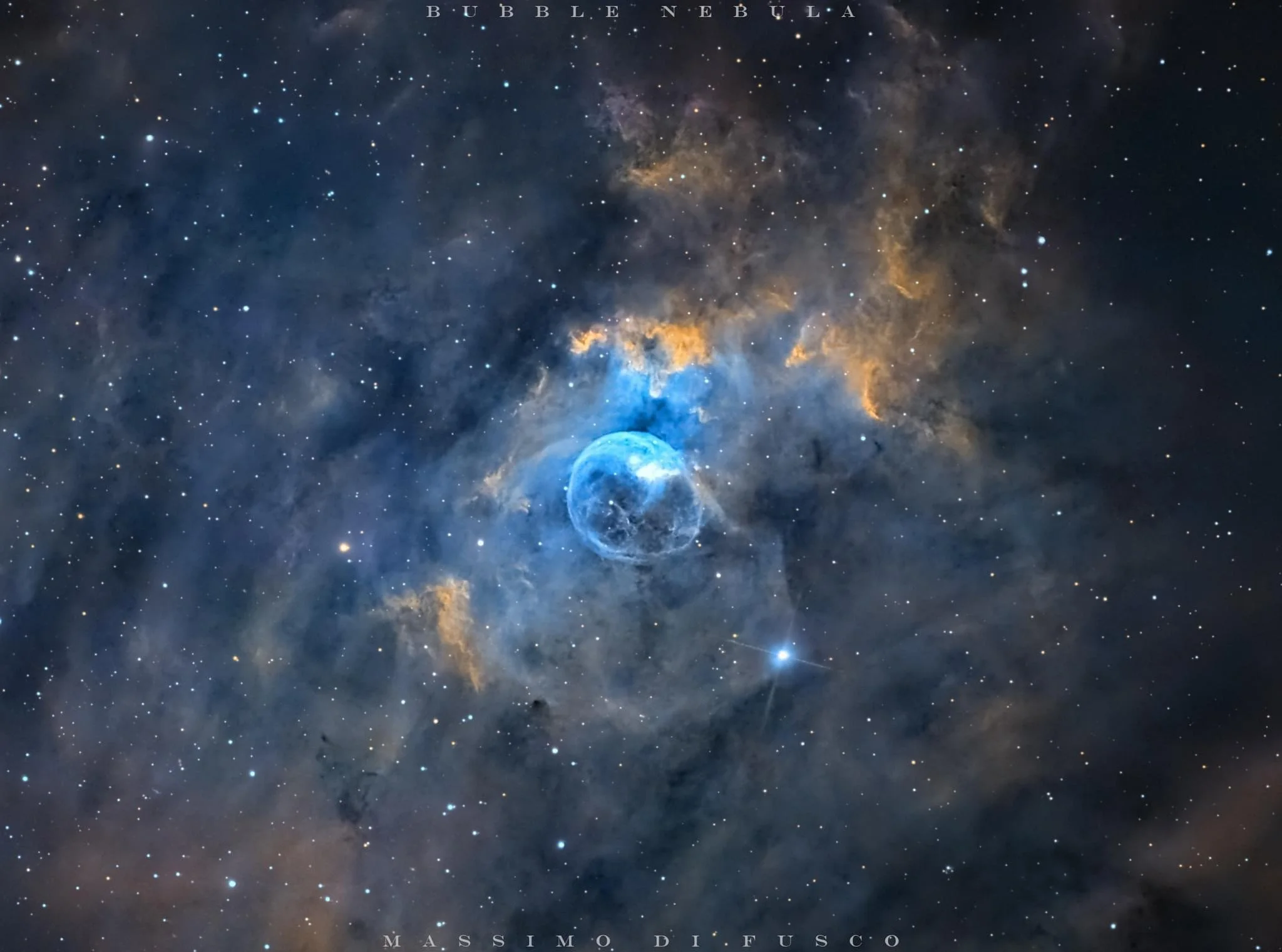 The subject of the photograph is the famous Bubble Nebula (classified as NGC 7635, Sharpless 162, or Caldwell 11) in the Cassiopea constellation towards the Cepheus border, discovered in 1787 by William Herschel.