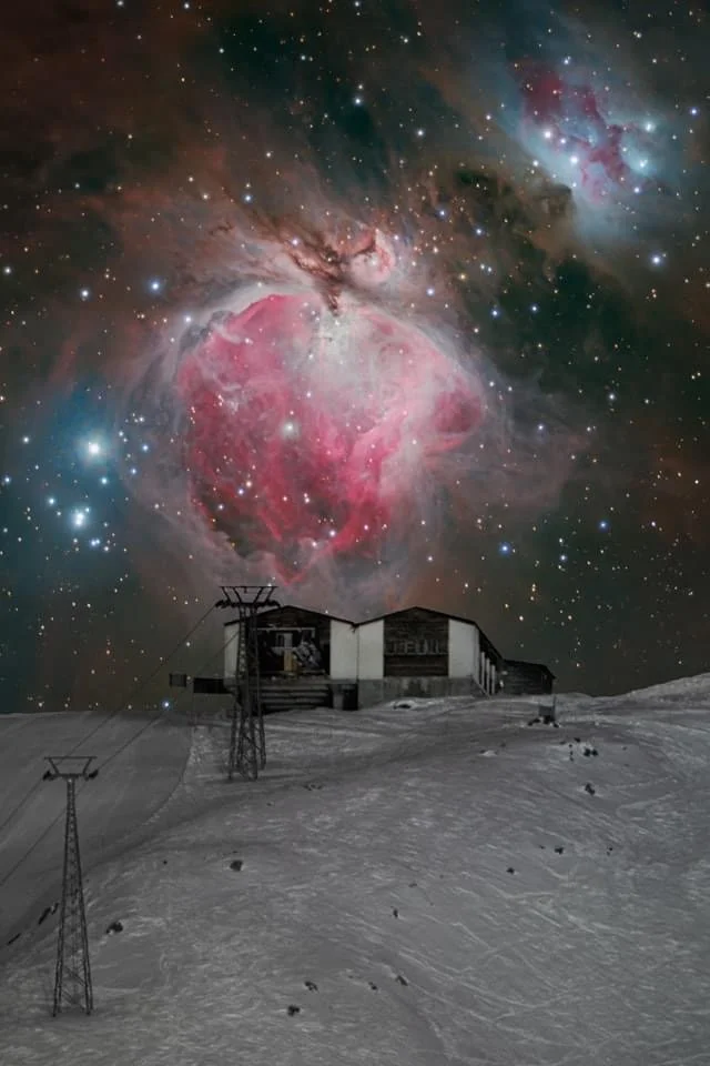 The camera position was roughly 2 miles away from the mountain station, and the telescope/camera combination has an extremely narrow field of view of only 1.5° x 2°. The resulting telephoto compression makes the otherwise tiny Orion Nebula appear huge.