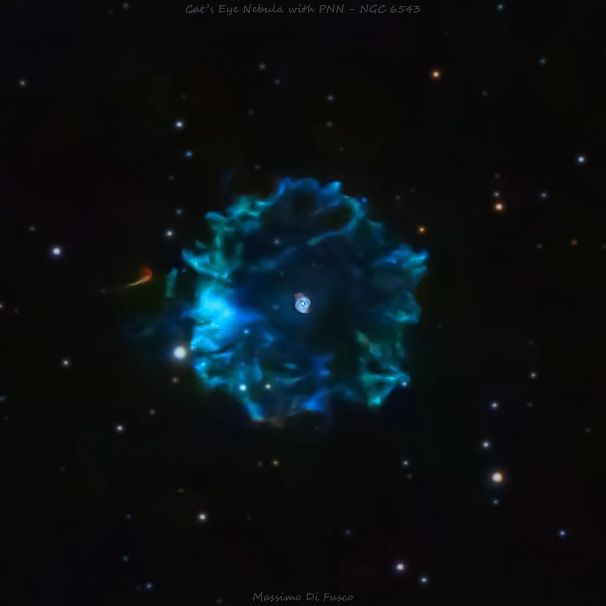 The Cat's Eye Nebula (also known as NGC 6543 or Caldwell 6) is a planetary nebula in the northern Dragon constellation, discovered by William Herschel on February 15, 1786. It was the first planetary nebula whose spectrum was studied by British amateur astronomer William Huggins, proving that planetary nebuluses were gassy in nature and not stellar. Structurally, the object was studied with high-resolution images obtained from the Hubble Space Telescope that reveal nodes, jets, bubbles and complex arcs illuminated from the core of the central heating planetary nebula (PNN).