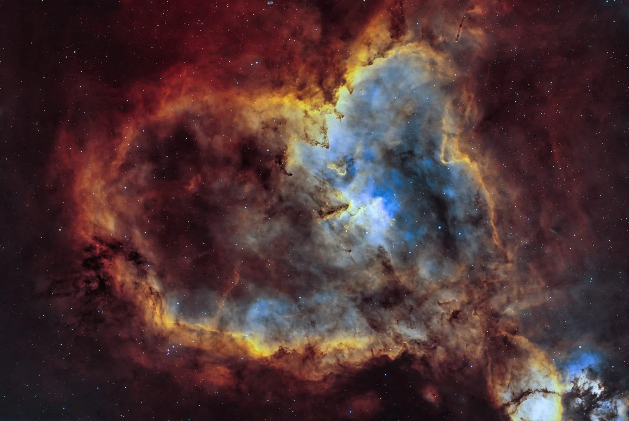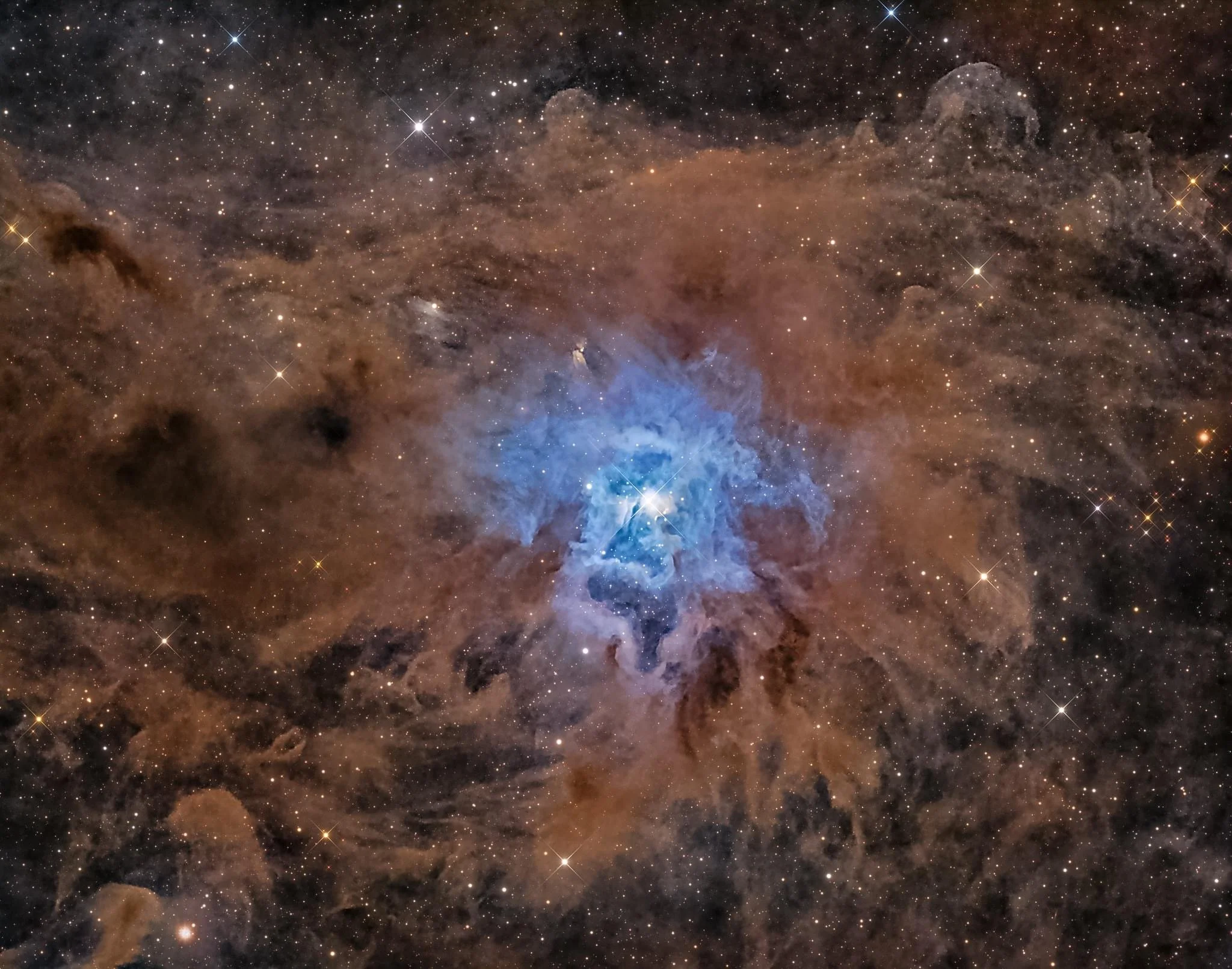 This image, shot during May to July 2024, shows a heavily crowded are in constellation Cepheus, with a blend of several nebula types. In the center, pillars of dust create a wormlike structure called LDN 1217, which ends in a bluish reflexion nebula (VdB 152). In the background, more dark nebulas can be seen, in some parts being lit by hot blue giants stars. In this area, it partially blocks the red light coming from the Ha strands farther away, which impairs the sense of perspective.