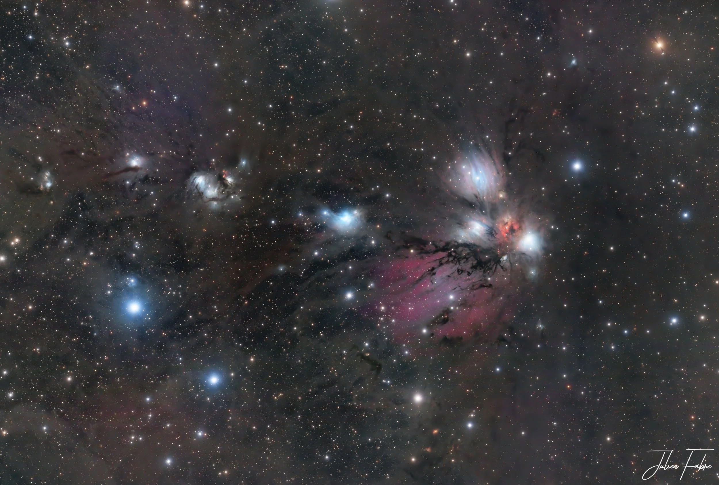 Image Description and Details : NGC 2170 is a dusty reflection nebula and stellar nursery that formed about 8 million years ago, located at the edge of the giant star-forming molecular cloud Monoceros R2, some 2,700 light-years away. the constellation of Monoceros. The bluish areas are reflection nebulae, so named because they reflect light from nearby hot stars. The red areas are emission nebulae and glow because ultraviolet light from nearby stars excites hydrogen and other gas atoms in the nebula, which then emit their own light in specific colors. What looks a bit like black ink spread across the image are dark nebulae, and are only visible because of the light they block.