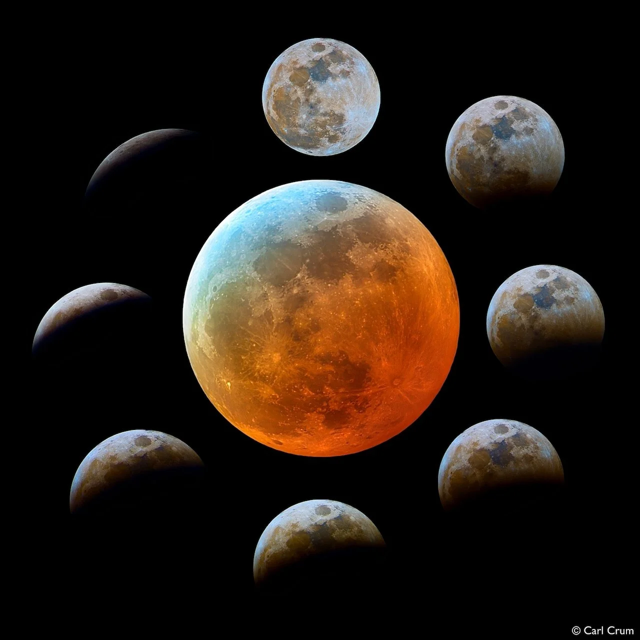 This stunning collage captures the stages of a total lunar eclipse, where the Moon gradually enters Earth’s shadow and transitions from a bright, silvery disk to a deep blood-red orb. Over the course of ninety minutes, the Moon traverses the umbra, the darkest part of Earth’s shadow, as sunlight refracted by Earth’s atmosphere scatters shorter wavelengths, allowing only the longer, redder wavelengths to illuminate the lunar surface.