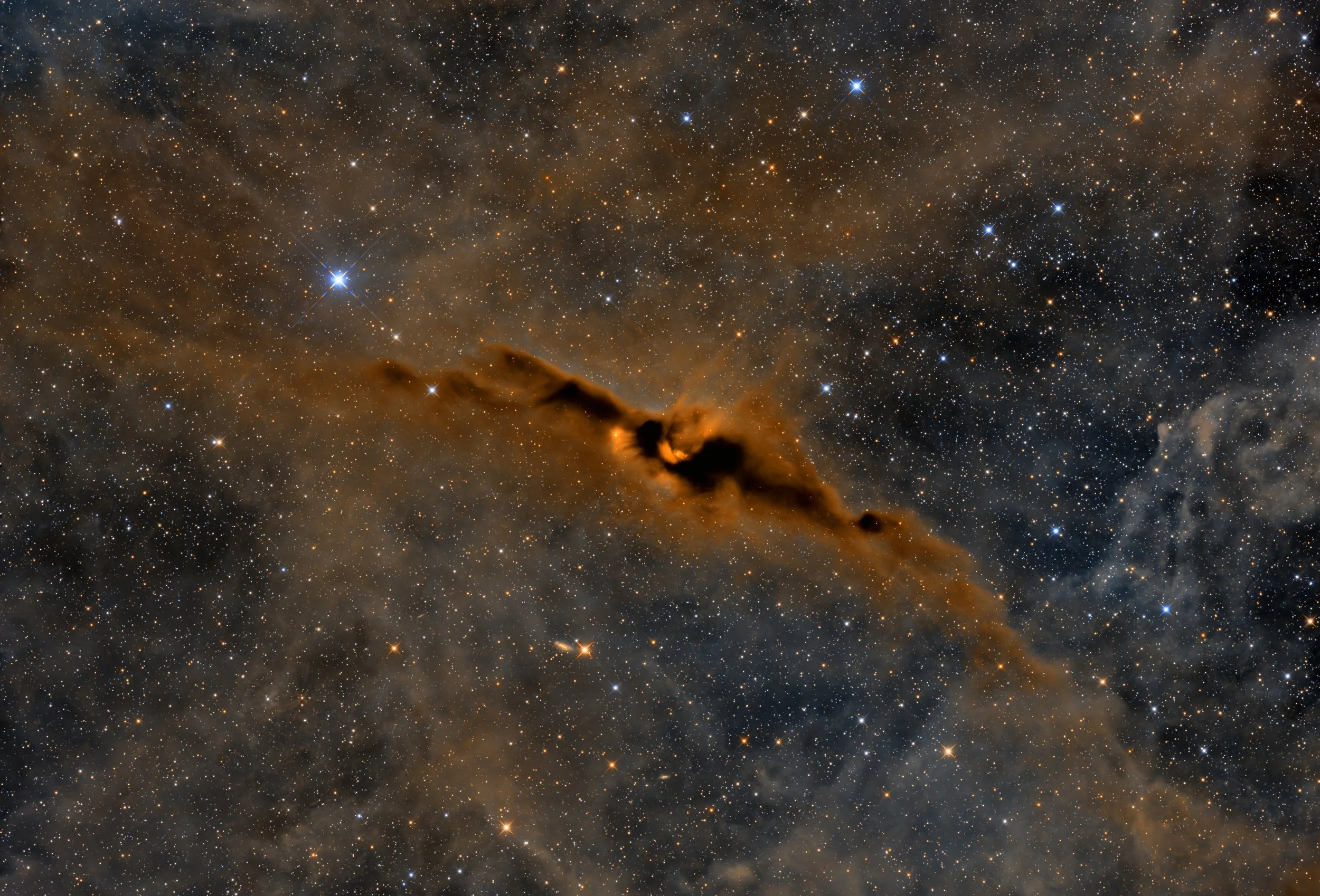 Embedded within LDN 43 is the young stellar object RNO 91, a protostar surrounded by an accretion disk, which emits jets of gas that interact with the surrounding cloud. The region also contains bright reflection nebulae where scattered starlight illuminates the dust. This image in RGB reveals the contrast between the dark, opaque dust and the faint glow of reflected light, offering a glimpse into the complex processes of star birth hidden within this cosmic nursery.