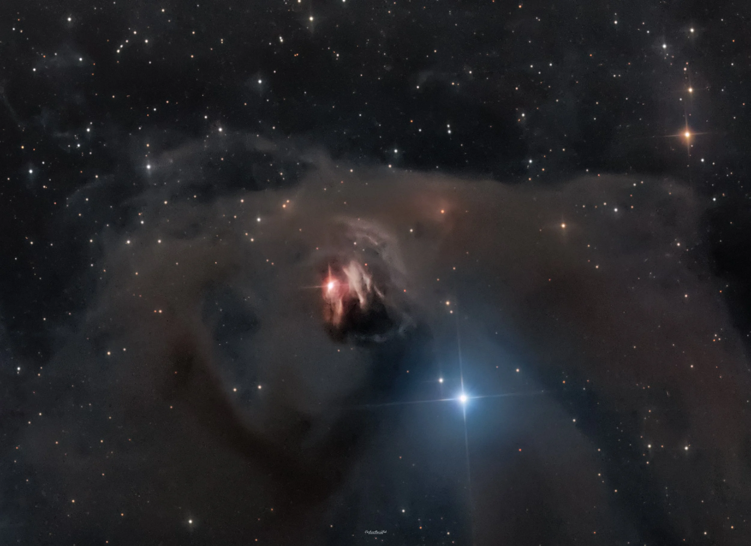 Image Description and Details: least photographed object.The Hind Nebula(Herbig-Haro object), prototypical example is the variable star T Tauri, visible as the bright orange star near the image center. The orange star centered in this remarkable telescopic sky view is T Tauri, prototype of the class of T Tauri variable stars. Surrounding T Tauri is a dusty yellow cosmic cloud named the Hind's Variable Nebula (NGC 1555/1554).