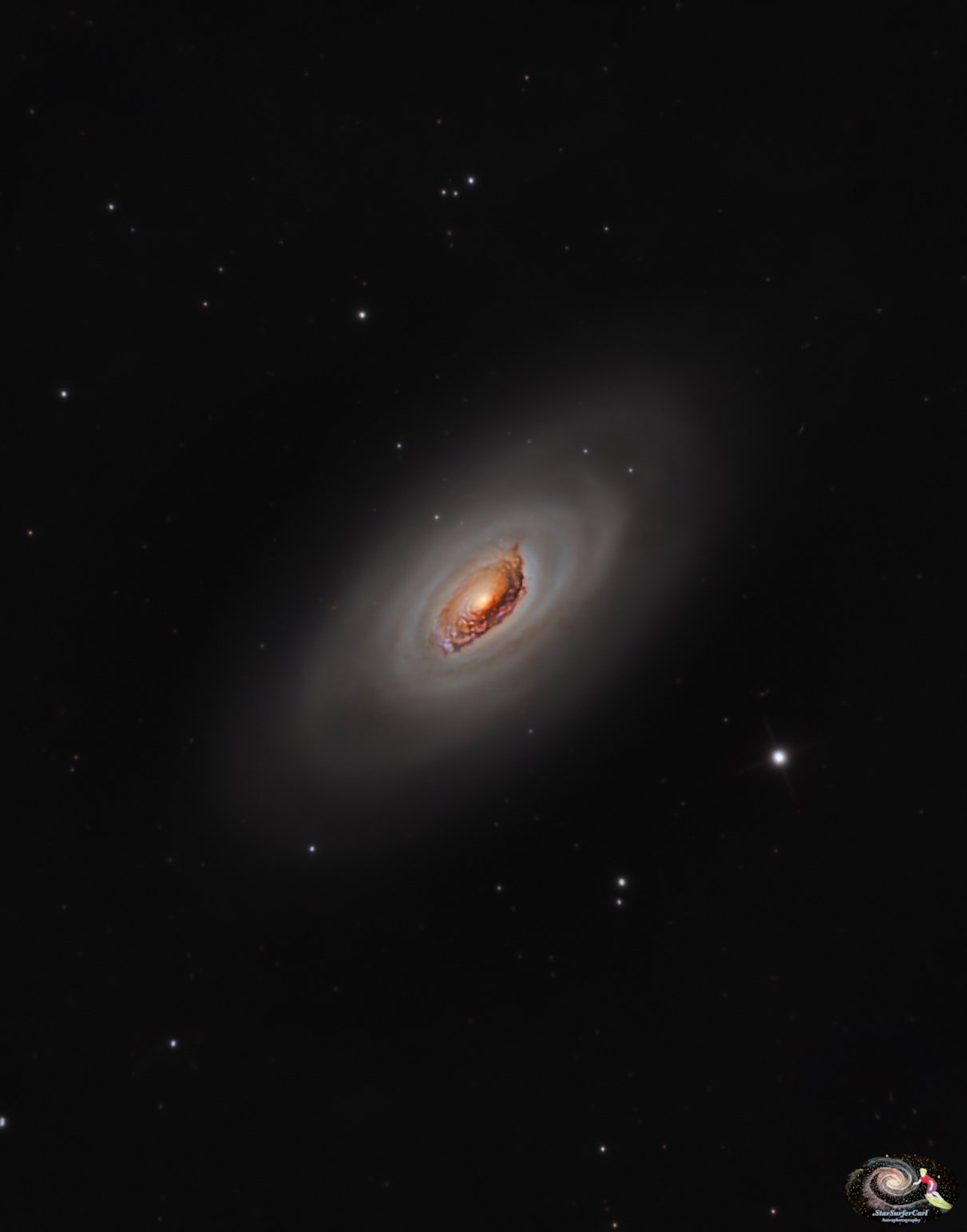 Image Description and Details : The Black Eye Galaxy, or M64, is located 17 million light-years away in the constellation Coma Berenices. Its nucleus is packed with impressive dust lanes laden with rigorous star formation. Charles Messier added this galaxy to his list in 1780, but it had already been discovered by English astronomer Edward Pigott in 1779.