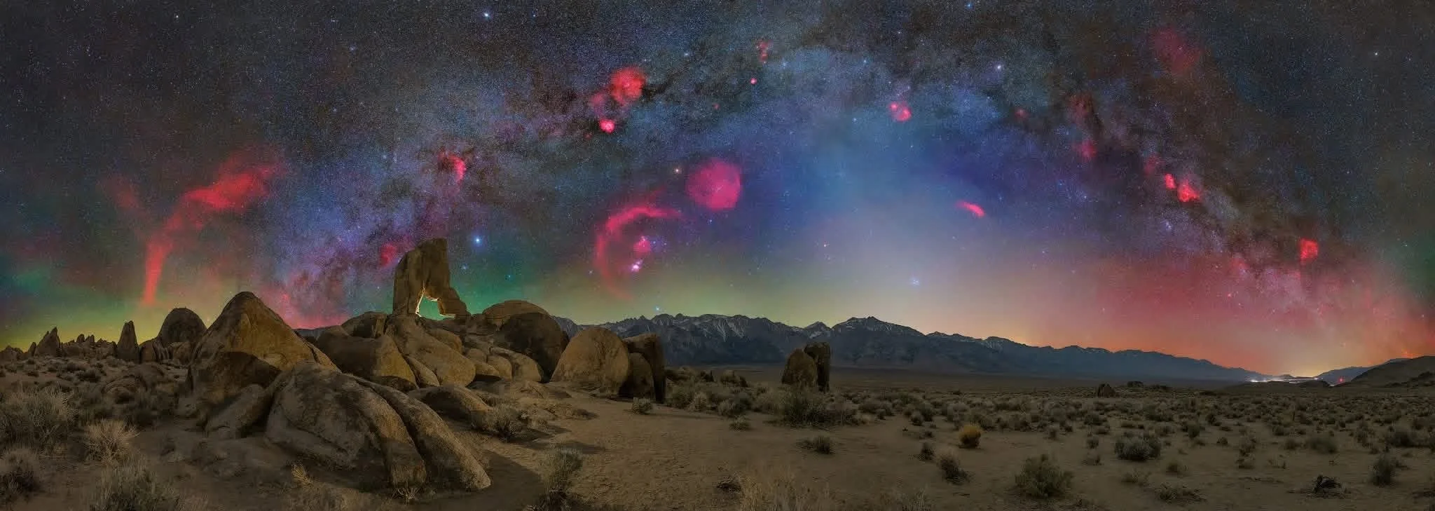 The amount of hydrogen-rich emission nebulae in this part of the Milky Way makes it one of my favorite subjects. As a special treat, part of the Gum Nebula is peeking like a flame over the southern horizon on the very left, collaborating with red and green airglow to beat the yellow light pollution from distant Los Angeles. Next to it, the Seagull Nebula soars high above Boot Arch, silhouetted against strong green airglow, while Orion sets over Mt. Whitney, the highest peak in the Sierra Nevada.