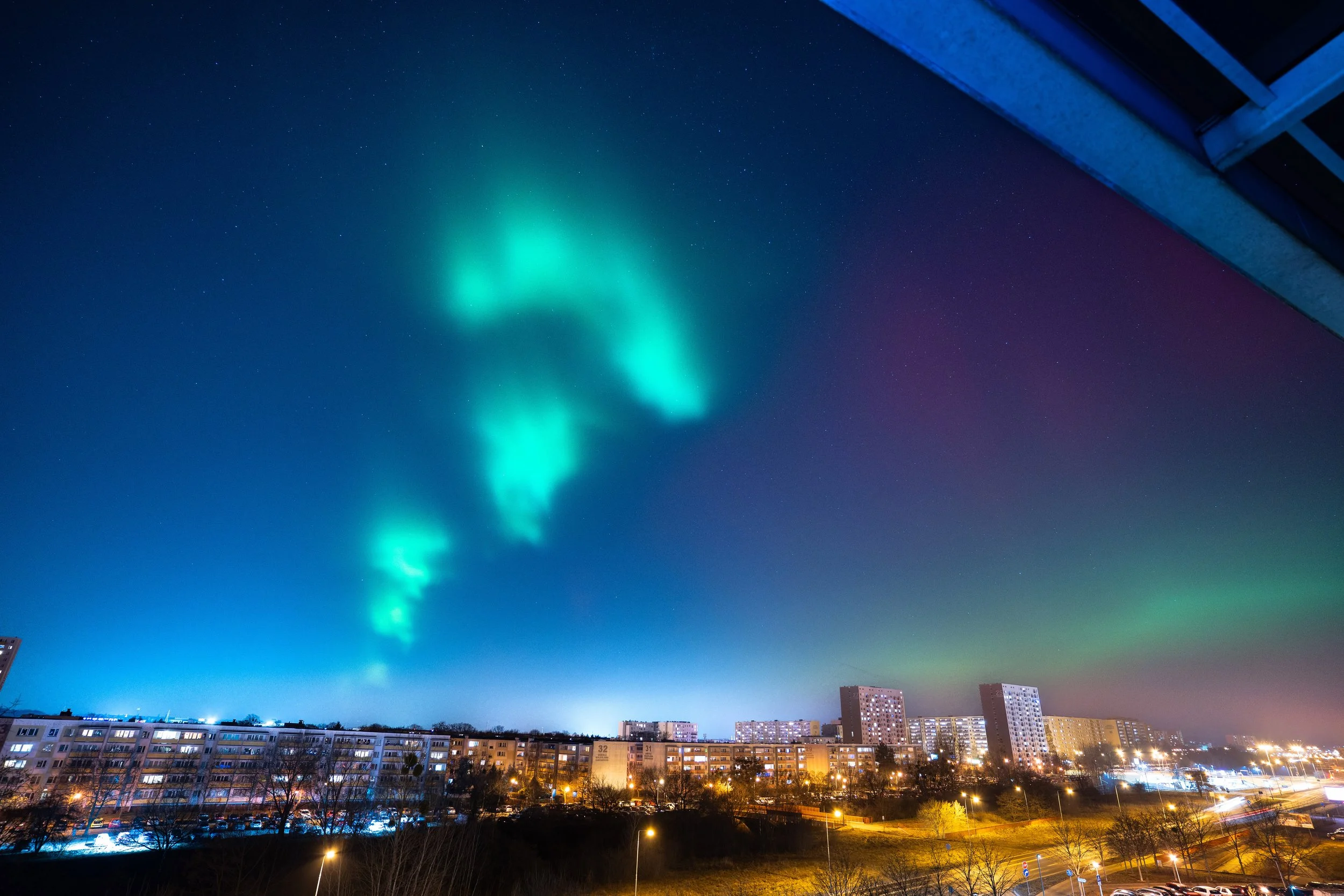 Description and Details: A beautiful green auroral arc visible high in the sky over the city of Poznań in west central Poland. At times, the phenomenon appeared directly overhead, reaching the zenith. The photo captures a brief, approximately two minute episode of green auroral structures observed above a large urban housing estate, despite strong light pollution. The image was taken with a Sony A7IV camera and a Tamron 17–28 mm f2.8 lens at a focal length of 17 mm, ISO 640, with an exposure time of 3.2 seconds.