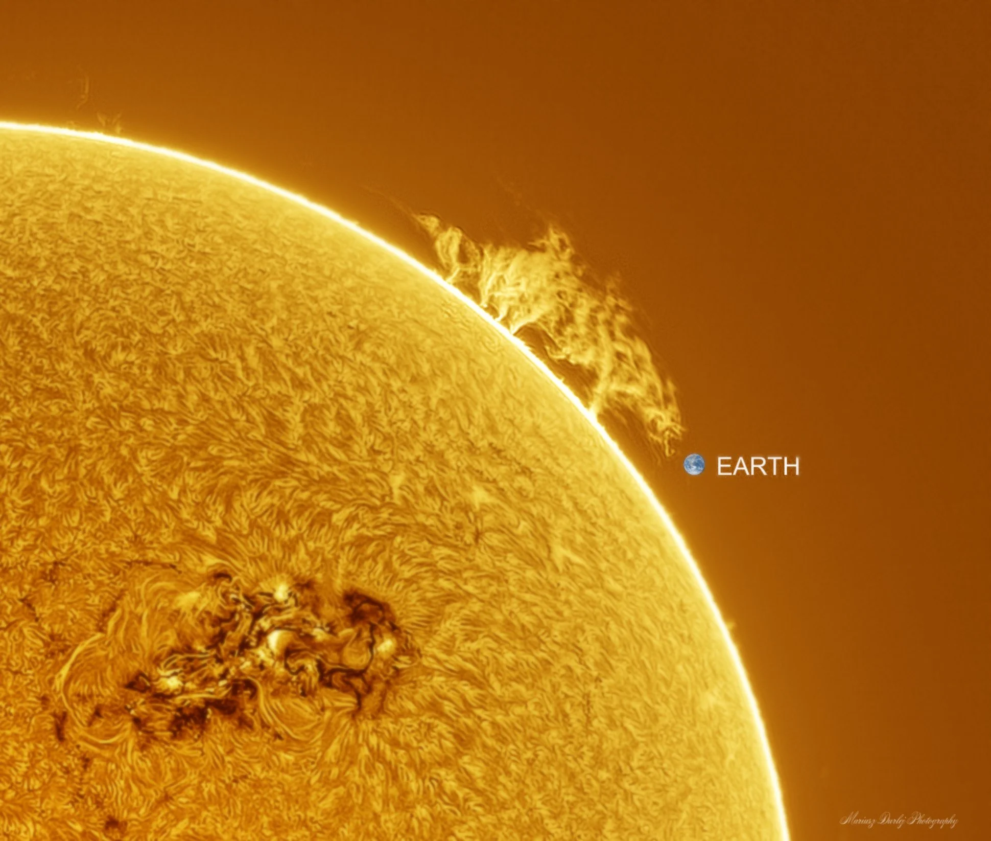 Enlarged view of area 3664 along with the prominence, the earth added to show scale.