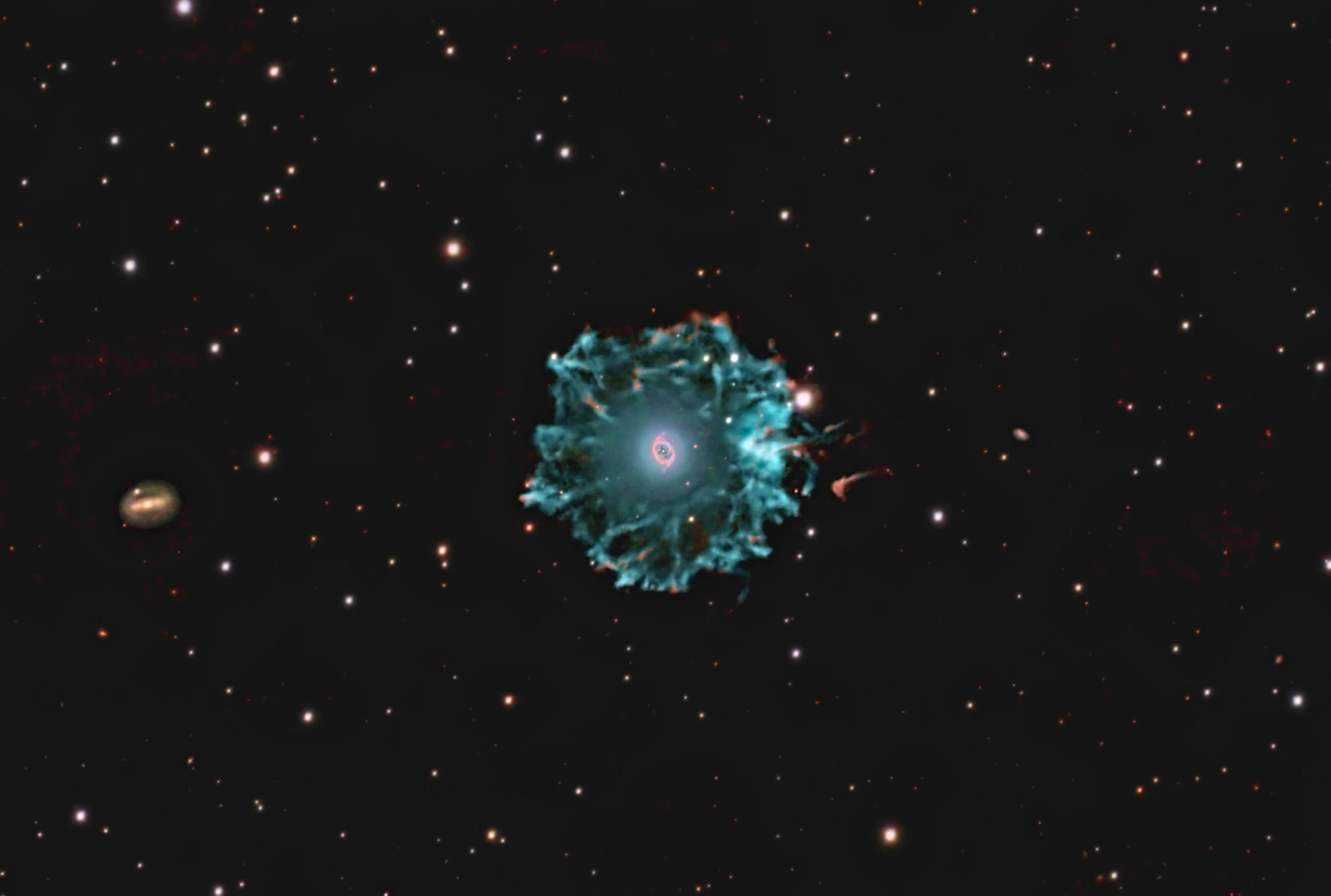 Image Description and Details : NGC 6543 is a planetary nebula ~3,300 light years away in the Draco Constellation. This was shot from Bortle 8 Dallas-Fort Worth over eight nights in June 2022. Equipment: Celestron EdgeHD 1100 at full focal length 10Micron GM1000HPS mount ZWO ASI6200MM-Pro main camera Chroma LRGB and 3nm Ha and O3 filters