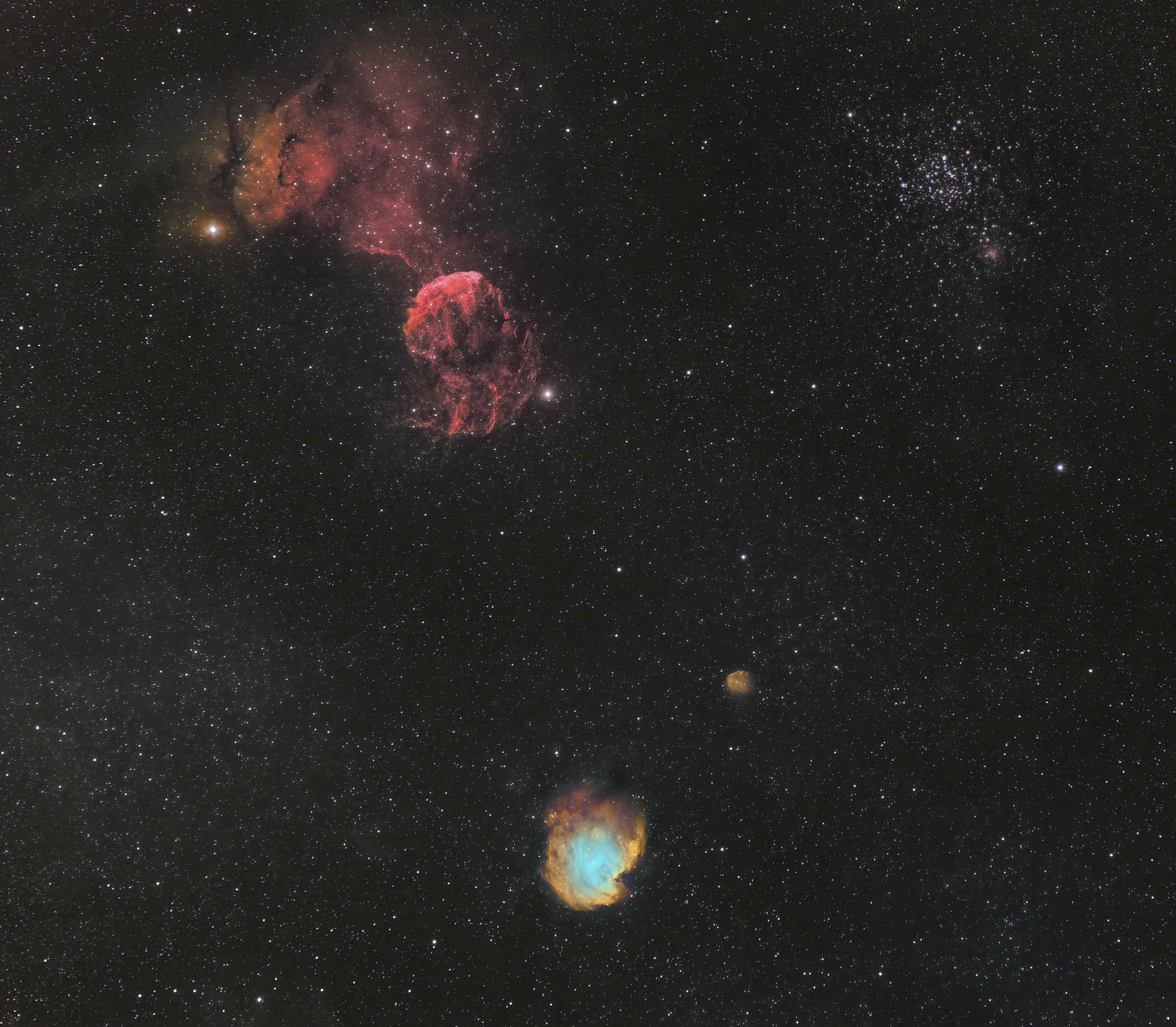 Image Description and Details : Here is my latest photo taken night before last in the back yard. It is featuring the Jellyfish in HOO palette , the Monkey Head in SHO palette , and Star Cluster Messier 35 in RGB. The nebulosity was captured using narrowband filters that only let specified wavelengths of Sulfur, Hydrogen, and Oxygen. The stars were captured with color separate filters for Red Blue and Green. I used a Rokinon 135mm camera lens at f/2 and an ASI294MM dedicated monochrome camera.
