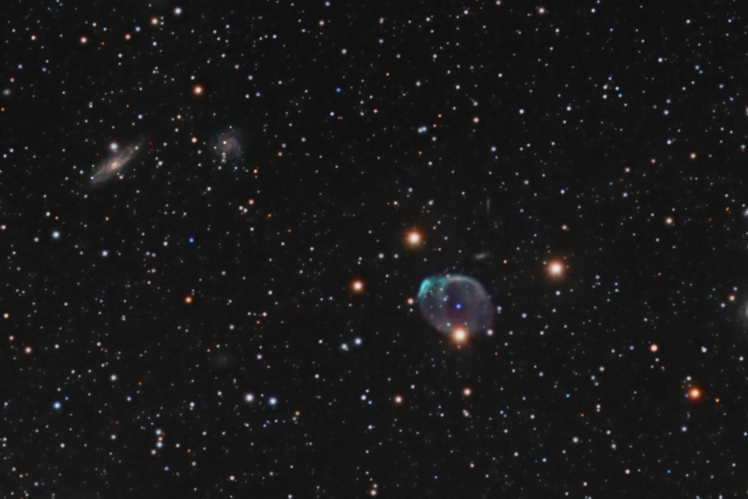 Image Description and Details : DeHt 2 is a faint (mag 14.9) planetary nebula in Ophiuchus. It is estimated to be 6000 to 10,000 light years from Earth. It was discovered in 1979 by J. Dengel, H. Hartl and R. Weinberger. The mag 13.5 spiral galaxy at upper left is UGC10943, located about 115 million light years away. Image captured on my remote dual rig at Fregenal de la Sierra in Spain between 13 May - 8 June 2022. Scopes: APM TMB LZOS 152 Refractors Cameras: QSI6120wsg8 Mounts: 10Micron GM2000 HPS A total of 68 hours 30 minutes (HaOIIILRGB)