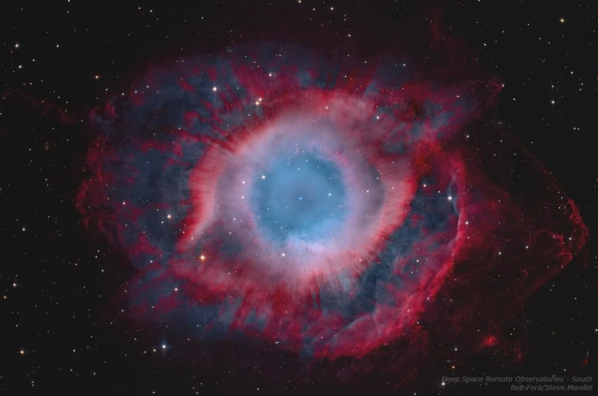 The Helix is a large planetary nebula that's nearby in astronomical terms (about 650 light years away) in Aquarius. Most images of it show the central blue/green region surrounded by a pink and red shell that gives it its namesake helix shape. But when you go deep with narrowband (H-alpha and Oiii) filters -- 29 hours in this case -- we realize that, like other similar nebulae such as the Ring and Dumbbell, it extends way beyond its bright central core.