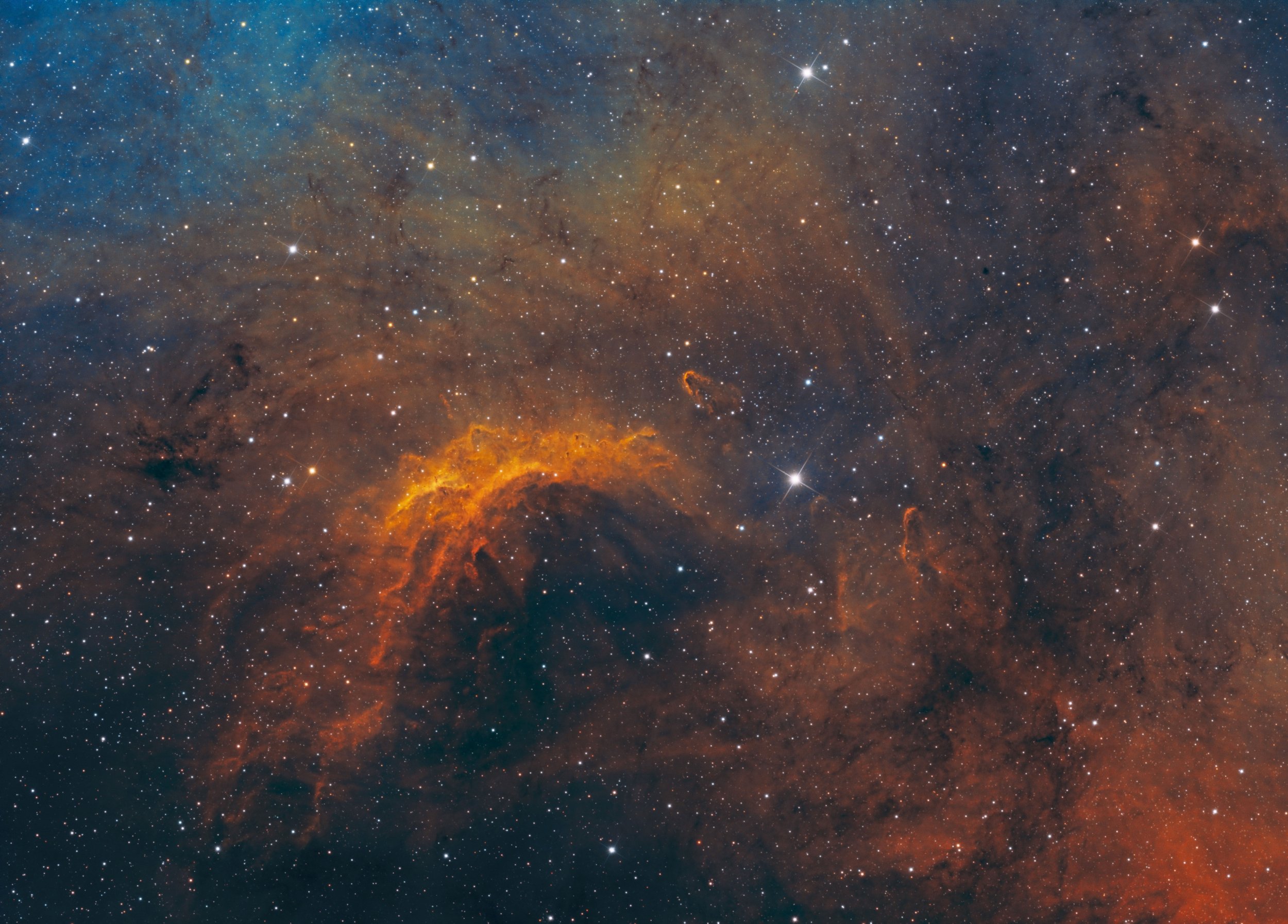 Image Description and Details : Within the North America Nebula (NGC7000), somewhere near Canada, lies this emission feature resembling a bonfire. This dynamic SHO mix uses SHO stars. Just under 30 hours integration time equally split between the SHO channels.