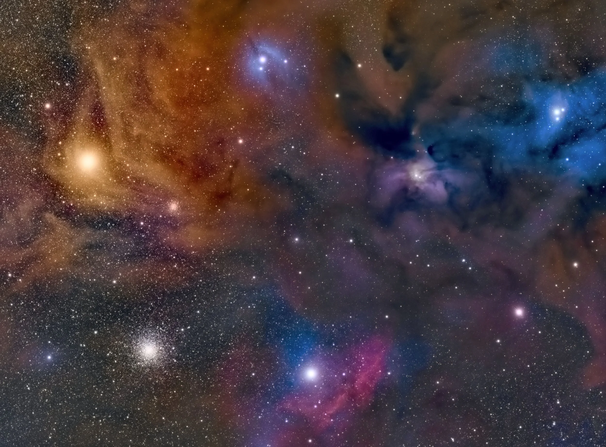Image Description and Details : The main goal of this project was to capture the exceptional, extremely colorful, gigantic region enclosing the emission, reflection and dark nebulae around stars named Rho Ophiuchi, Antares and Alniyat, as well as neighboring objects (M4 globular cluster and others). This region is commonly referred as Rho Ophiuchi Molecular Clouds Complex in the astronomical literature. The nebulae have very intensive colors depending on the ionized and molecular gas composition (yellow-orange and reddish colors) or due to the visible light reflexion (blue colored nebulae). Dark nebulae does not transmit much light due to the presence of interstellar dust. This region covers a gigantic region on the night sky compared to many other deep space objects and is located on the border of the Scorpius and Ophiuchus constellations. A total length of 8 Full Moons could be placed side-by-side on the wider, horizontal side of this mosaic. The high dynamic range of colors and contrast in each panel, as well as the size of each file (few gigabytes due to the high resolution) resulted in complex and unusually long computer processing procedures. This 4-panel mosaic is produced by combining the integrated data collected using two different telescopes (Askar FRA400 and William Optics FLT-91) in the last two years. The same astronomic camera (ZWO ASI294 MM Pro with thermoelectric cooling) and same dichroic broad-range filters (Chroma RGB set) were used. Total integration time is on average 4.5 hours per panel. Imaging sessions required a total of 7 car trips to two different locations (Rudine near Skopje and Radibush near Kriva Palanka) spanning driving around 800 km. Difference in the telescopes focal length (280 and 432 mm) and changes in the atmospheric conditions between different nights impose real processing challenge. Technical details Telescope: William Optics Fluorostar 91 and Fla t6AIII focal reducer/flattener (fl=432 mm). Imaging camera: ZWO ASI294MM Pro. Guiding camera: ZWO ASI174MM Mini via ZWO OAG;. Guiding and acquisition control: AsiAir Plus. Mount: iOptron CEM40EC. Filters: Chroma (RGB). Frames: Red: 124x180" (6h 12') (gain: 120.00) -15°C bin 1x1; Green: 128x180" (6h 24') (gain: 120.00) -15°C bin 1x1; Blue: 121x180" (6h 3') (gain: 120.00) -15°C bin 1x1. Total integration of the mosaic: 18h 39m. Integration per panel: 4h 40m. Dates: June 4, 2021 · June 8, 2021 · July 6, 2021 · May 24, 2022 · June 2, 2022 · June 27, 2022 · July 4, 2022.