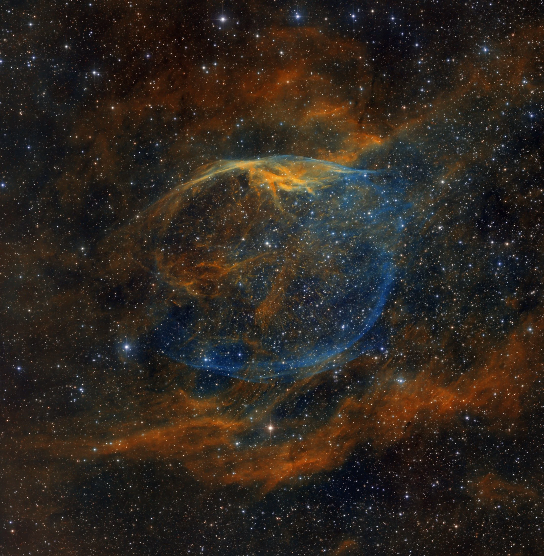 OIII and especially SII signal is pretty weak but the Ha channel shows some nice jet like structures in the bubble.