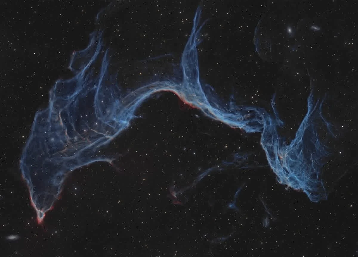 What makes ESO 217-25 so striking is its extraordinary texture. Rather than forming a smooth shell, the remnant has broken into shock-compressed sheets, twisted streamers, and translucent oxygen-rich veils. The luminous blue filaments trace ionized oxygen, while the thin red edges mark hydrogen emission where the blast wave is still colliding with surrounding interstellar gas. The bright central arc is one of the most active visible sections of the shock front, while the fainter detached wisps reveal how fragile and diffuse the structure has become as the remnant continues to expand.