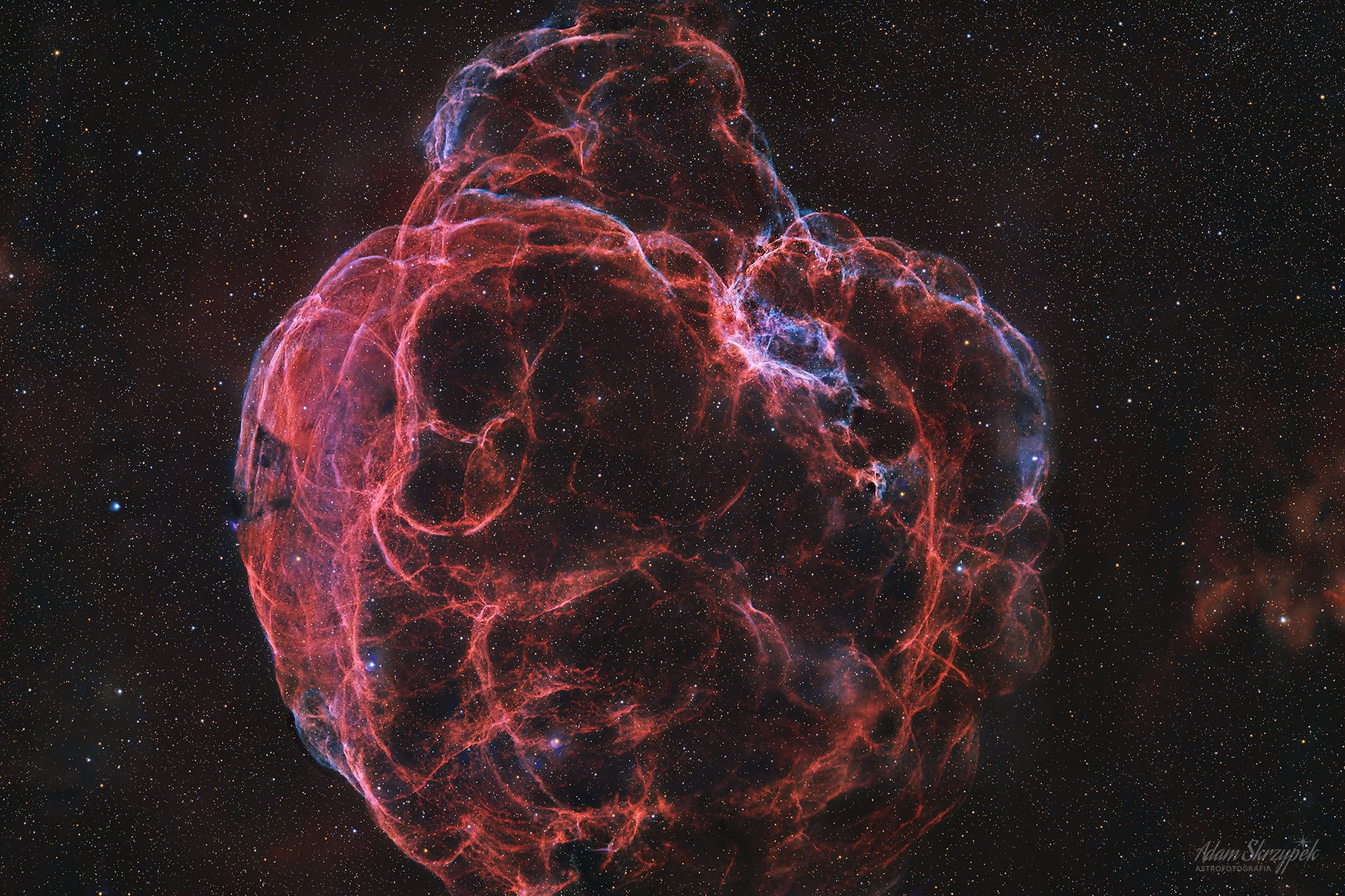 Description and Details: Spaghetti Nebula (Sh2-240), which is incredibly faint and therefore difficult to capture and process. This image consists of 180 exposures of 10 minutes each, giving a total of exactly 30 hours of integration time. I dedicated many winter nights and hours spent at the computer to this photo.