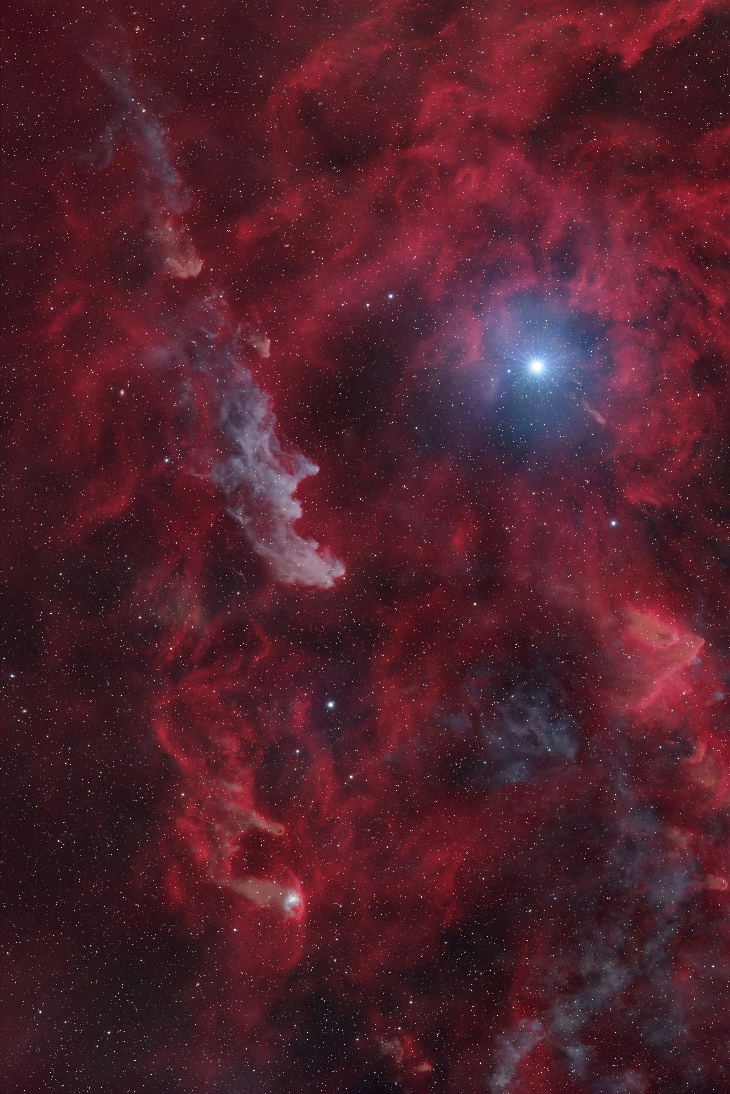 This wide-field view captures the dazzling blue supergiant star Rigel, the brightest star in Orion, and its spectral neighbor, the Witch Head Nebula (IC 2118). Rigel’s intense ultraviolet light illuminates the Witch Head, creating its ghostly blue glow as it reflects off interstellar dust. The intricate textures of the nebula resemble a witch's profile, adding a mythical touch to this cosmic scene.