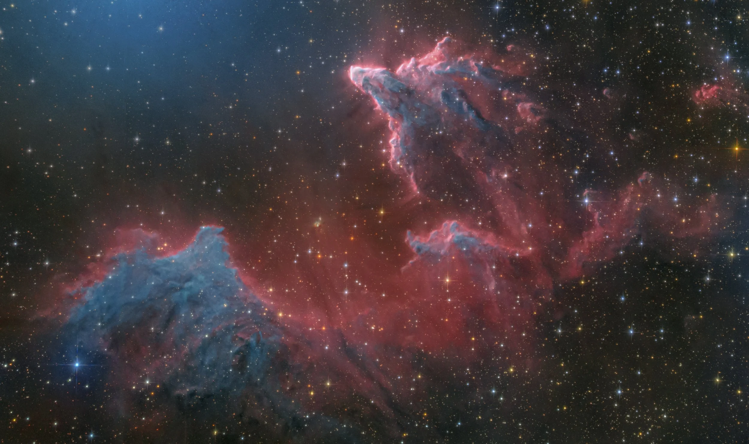 The Ghost's ethereal glow is the result of radiation from Gamma Cassiopeiae, an unstable B-class star that shines thousands of times brighter than the Sun. This radiation energizes the surrounding hydrogen gas, causing it to fluoresce in a reddish hue typical of H-alpha emissions. Meanwhile, the nebula's bluish wisps are created by interstellar dust reflecting Gamma Cassiopeiae's intense starlight, giving it a haunting, ghost-like appearance.