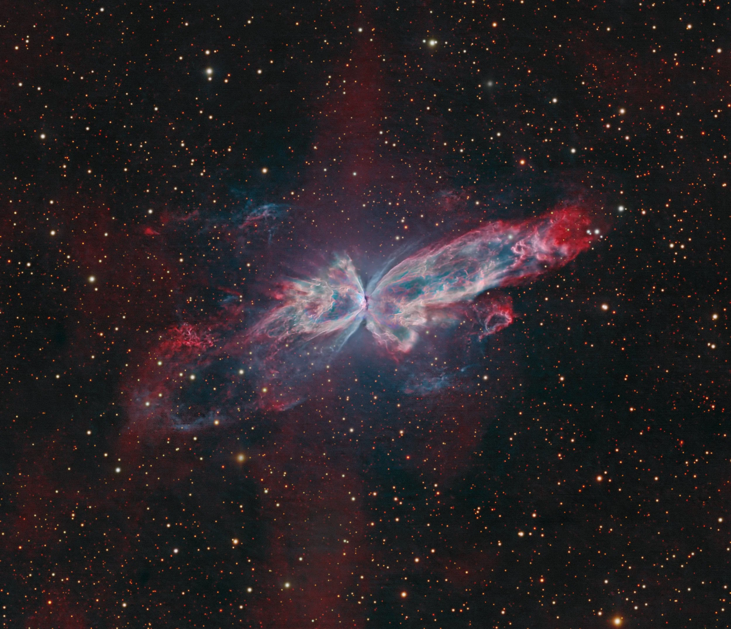 Unfolding like celestial wings, NGC 6302—commonly called the Butterfly Nebula—captures the dramatic final stages of a sun-like star’s life. This bipolar planetary nebula spans over two light-years and is located in the constellation Scorpius, roughly 3,800 light-years from Earth. Its vibrant wings are composed of material violently ejected from the dying star at its center, which remains hidden behind a dense torus of dust.