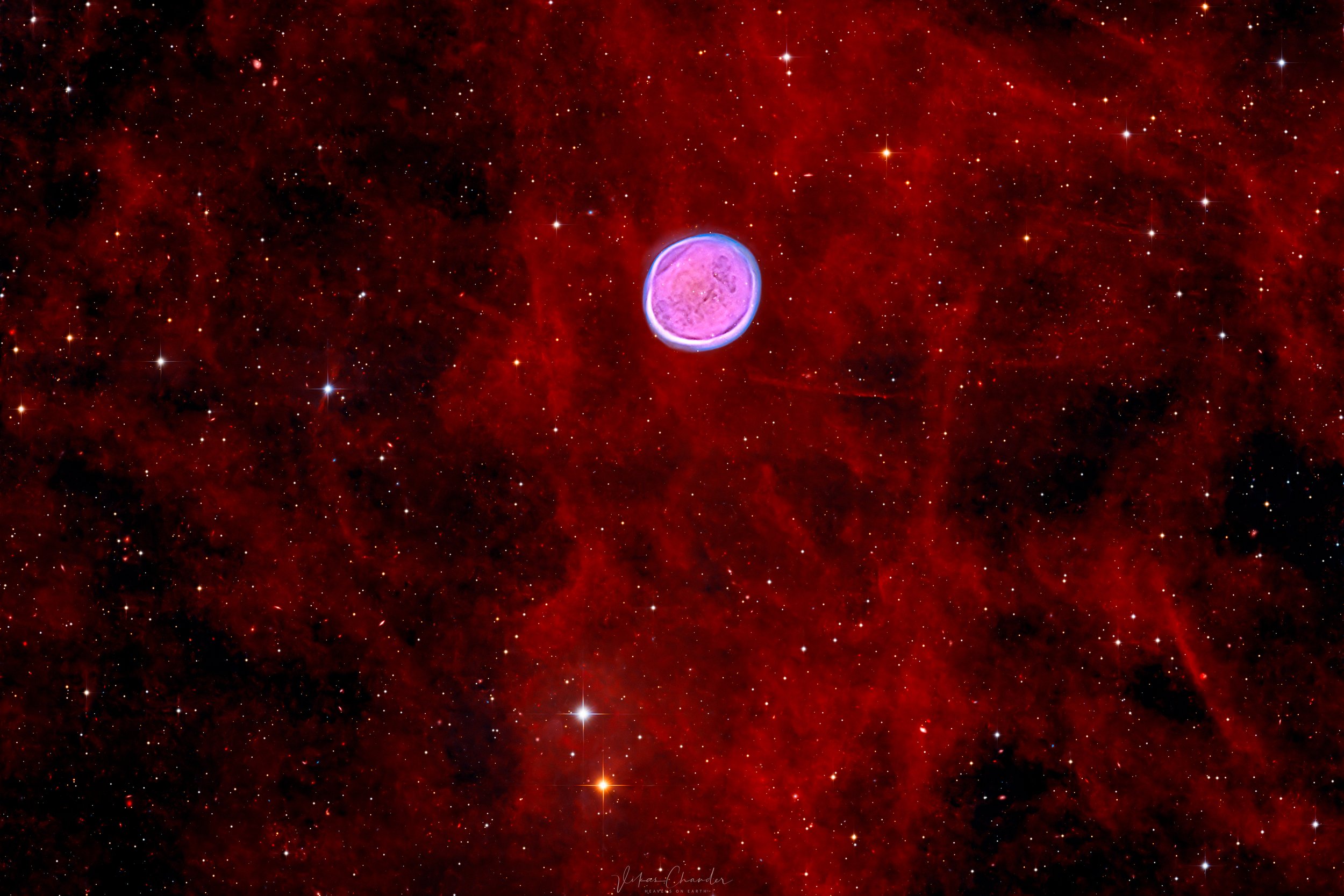 This extraordinary bubble swimming in a glowing red sea of hydrogen may appear supernatural and mysterious to most, but it is a familiar astronomical object, a planetary nebula. Planetary nebulae are created by the ejected and expanding gas of a dying star and although they are brilliant and intriguing objects in the initial stages of formation, these bubbles fade away as their constituent gas moves away and the central stars grow dimmer.