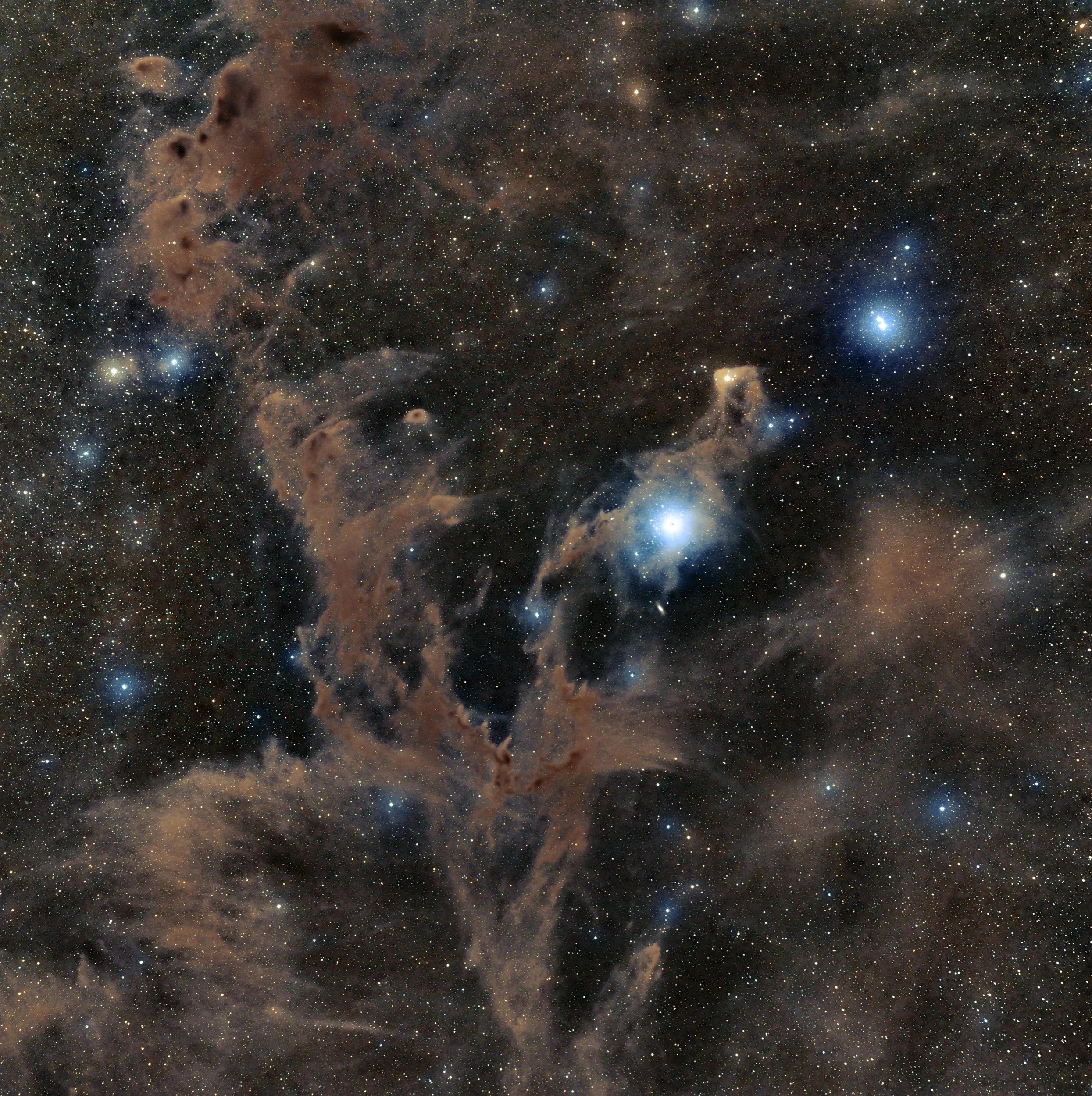 The dark nebula complex in the constellation of Chamaeleon emits a brown hue in the image due to its strong red and near-infrared colors. The the bright star Beta Chamaeleontis is visible just to the right of center with the dust that surrounds it preferentially reflecting blue light from its primarily blue-white color. Beta Chamaeleontis, latinized from β Chamaeleontis, is the third-brightest star in the southern constellation of Chamaeleon, approximately 298 light years away from sun. The star has five times the mass of the Sun and 2.8 times the Sun's radius.