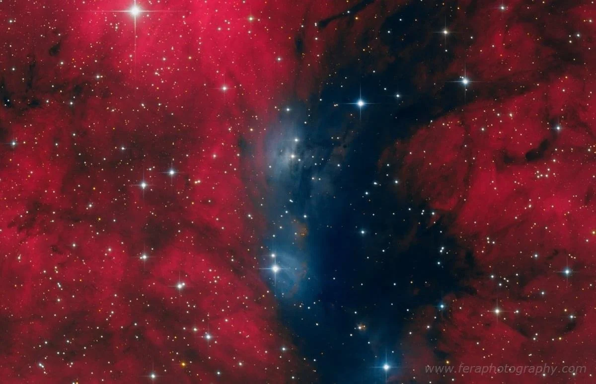 NGC 6914 is the blue reflection nebula in the center of this field that's otherwise filled with dust and red emission from glowing Hydrogen gas.