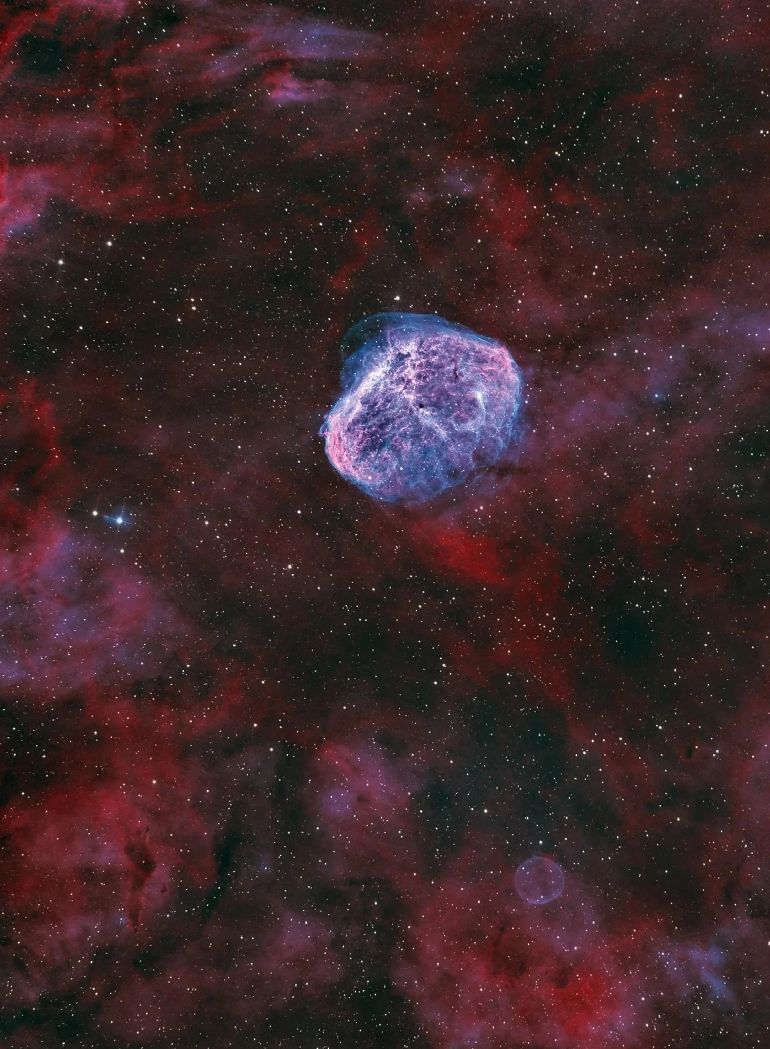Image Description and Details : NGC 6888 captured during multiple nights between 2 and 13 July 2021, with two RC 8" on EQ6 mount and CEM70, two QHYCCD 183M camera and a CFW3 filter wheel equipped with Baader LRGB filters and Optolong LRGB-HA-Oiii fillter.