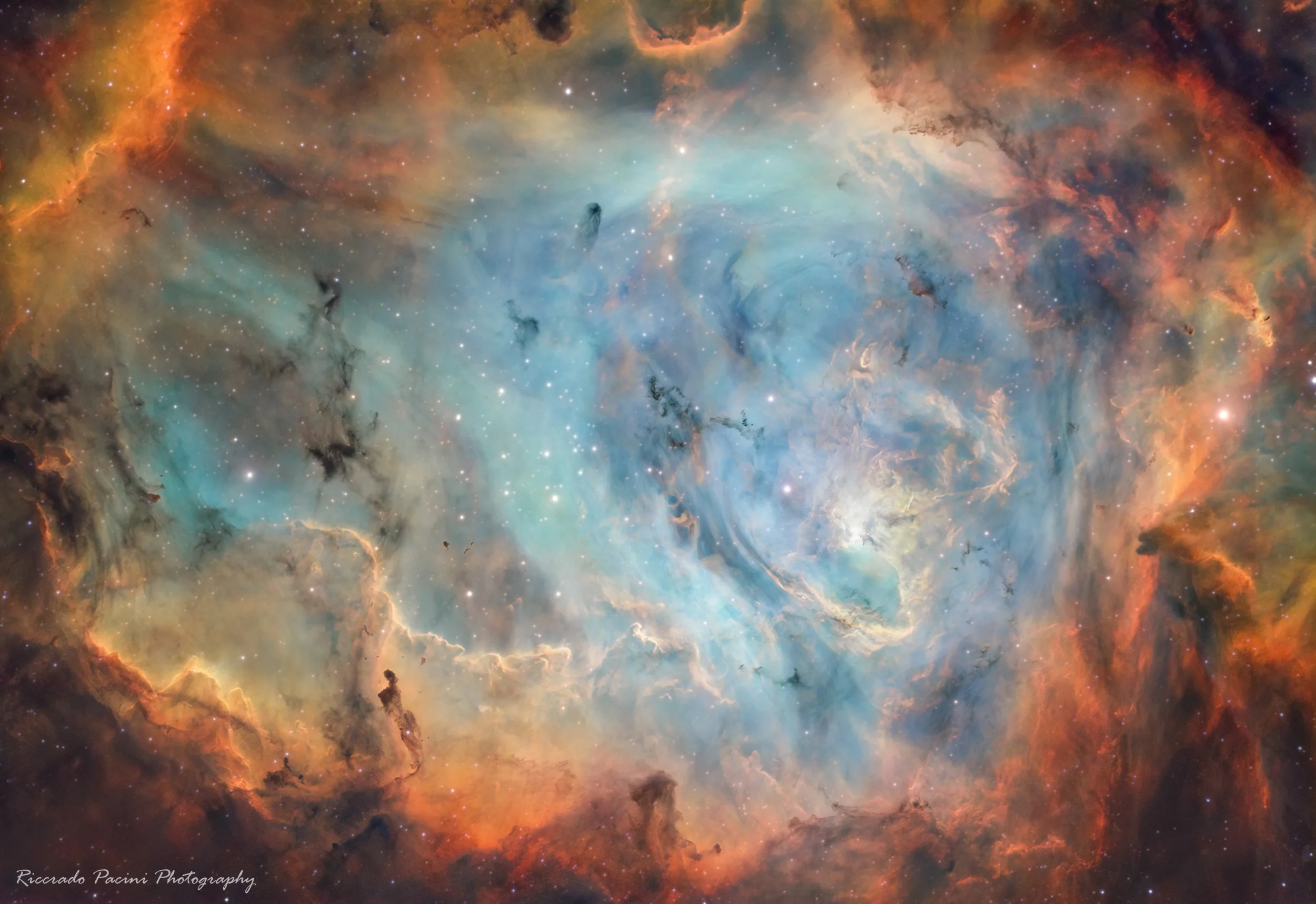 This vibrant wide-field mosaic captures the rich H II region of Sagittarius, home to two of the most iconic star-forming regions in the night sky—the Lagoon Nebula (M8) and the Trifid Nebula (M20). Rendered in the SHORGB palette, the image highlights colorful emission structures: blue-green oxygen regions, sulfur filaments, and active hydrogen zones swirling around massive stars and dark dust lanes.