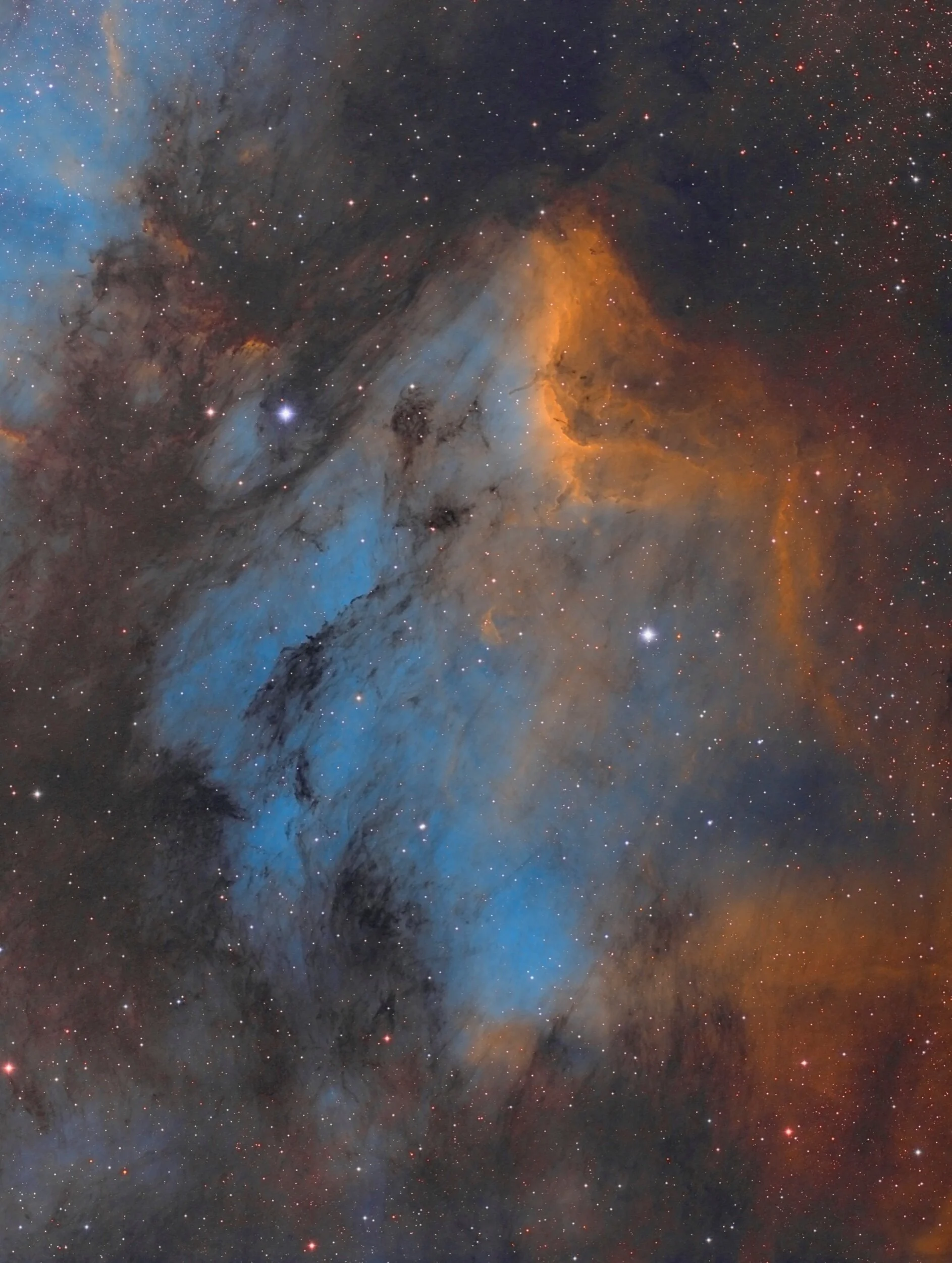 The dark nebula in the upper part of the photo is the gas bridge splitting visually the Pelican Nebula and the North America nebula so that the they look like two separate nebula. In reality they are actually a one large emission area.