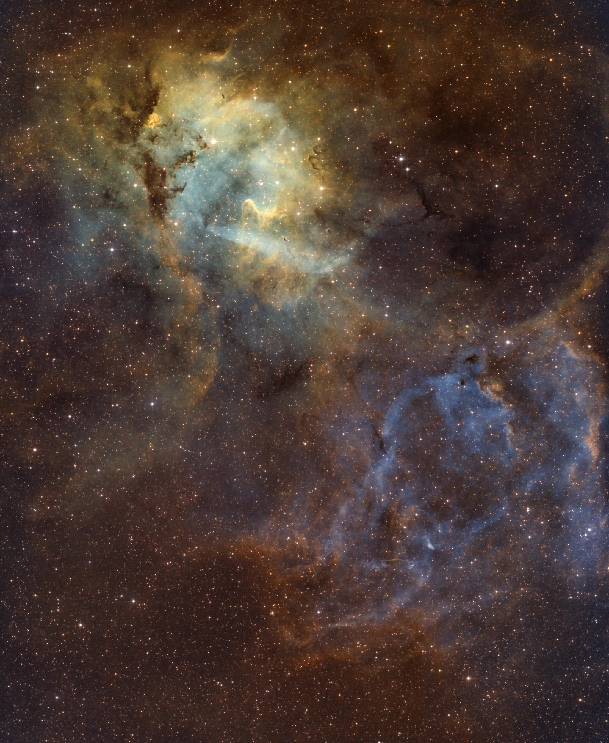 About two weeks ago, I processed a monochrome Hα image of this interesting object on the border of Cepheus and Lacerta. Last Monday the sky unexpectedly cleared. I decided to spend the night on acquiring OIII data to create an Hα-OIII-OIII false colour image, where Hα is assigned to the red channel, OIII to the blue channel and a mix of Hα and OIII to the green channel. Although it stayed clear all night, I only used the images captured before midnight. In the area in the Netherlands where I live, the sky severely brightens from midnight to dawn because horticulturalists are then allowed to ignite assimilation lights. Although the used OIII filter has a bandwidth of only 4nm, the light pollution caused by the glasshouse horticulture severely affects the quality (signal-to-noise ratio) of the images. I'll post a separate message to illustrate the difference in sky quality before and after midnight.