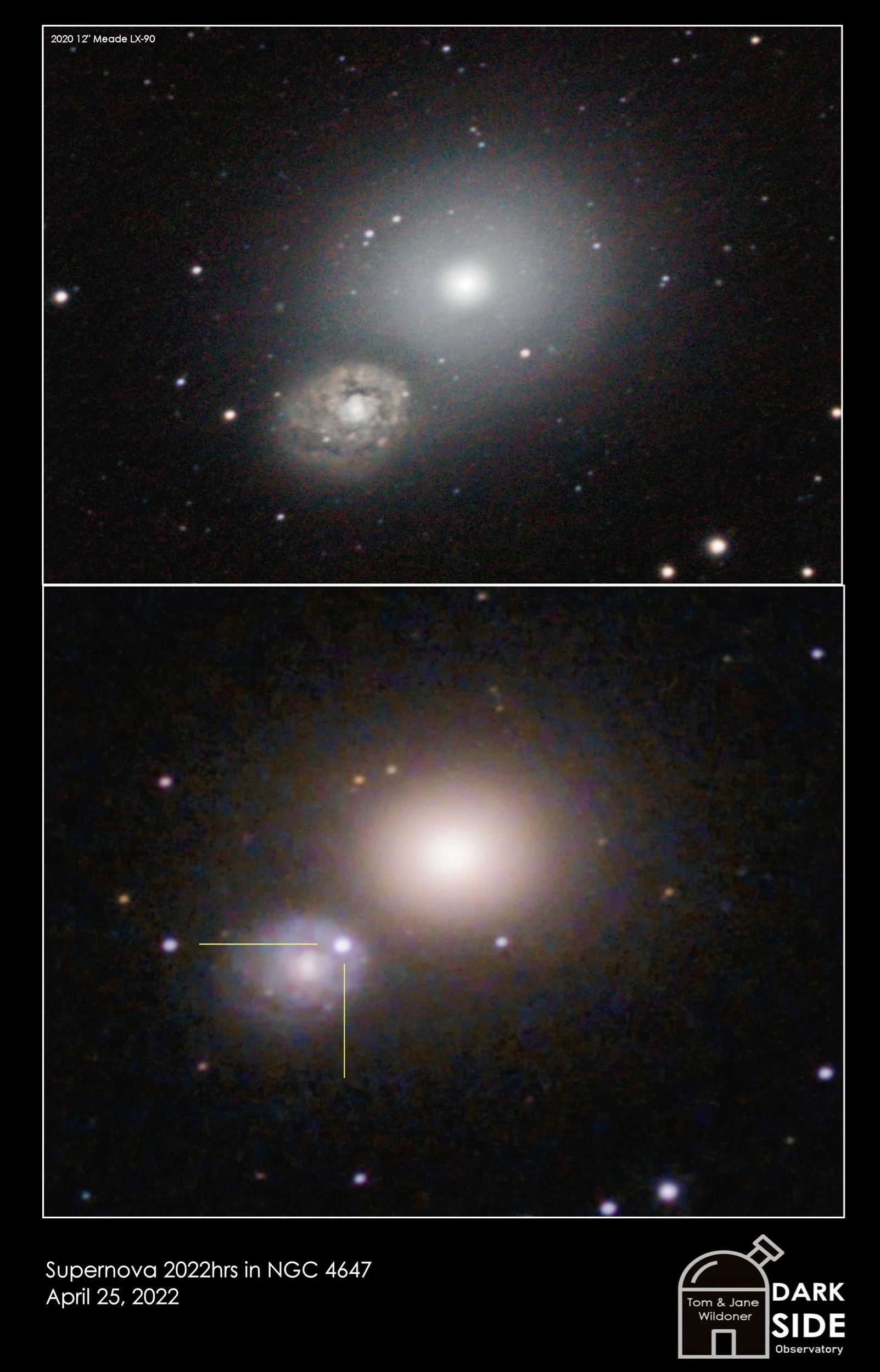 Image Description and Details : Here is a quick view of a new supernova located in the galaxy NGC4647 and discovered by Koichi Itagaki on April 16, 2022. At the time of imaging it was at magnitude 12.6. The comparison image on the top was taken using my 12” Meade LX-90 back in 2020. The large elliptical galaxy next to NGC4647 is Messier 60 (M60), they form a pair known as ARP116 and are interacting with each other.