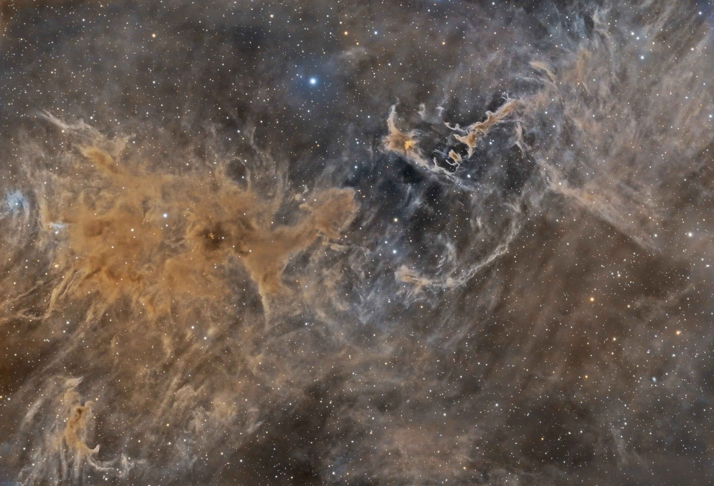 In this image we can see a dusty area in the constellation of Cepheus, the diffuse molecular clouds are catalogued as LBN 550, LBN 552 and LBN 555 and LDN 1228.