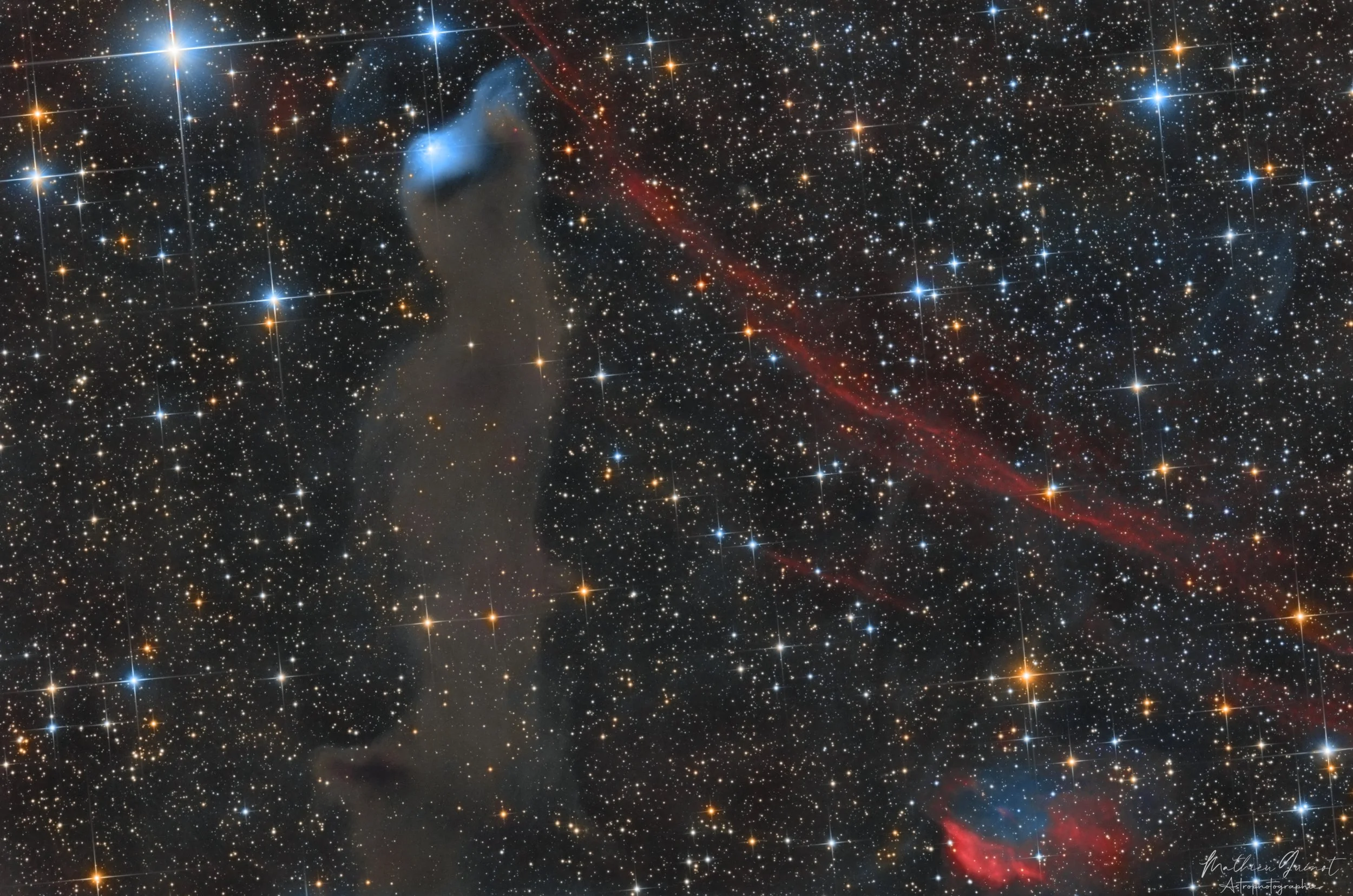 - the reflection nebula Vdb 152, shining a characteristic blue at the top of this dark pillar