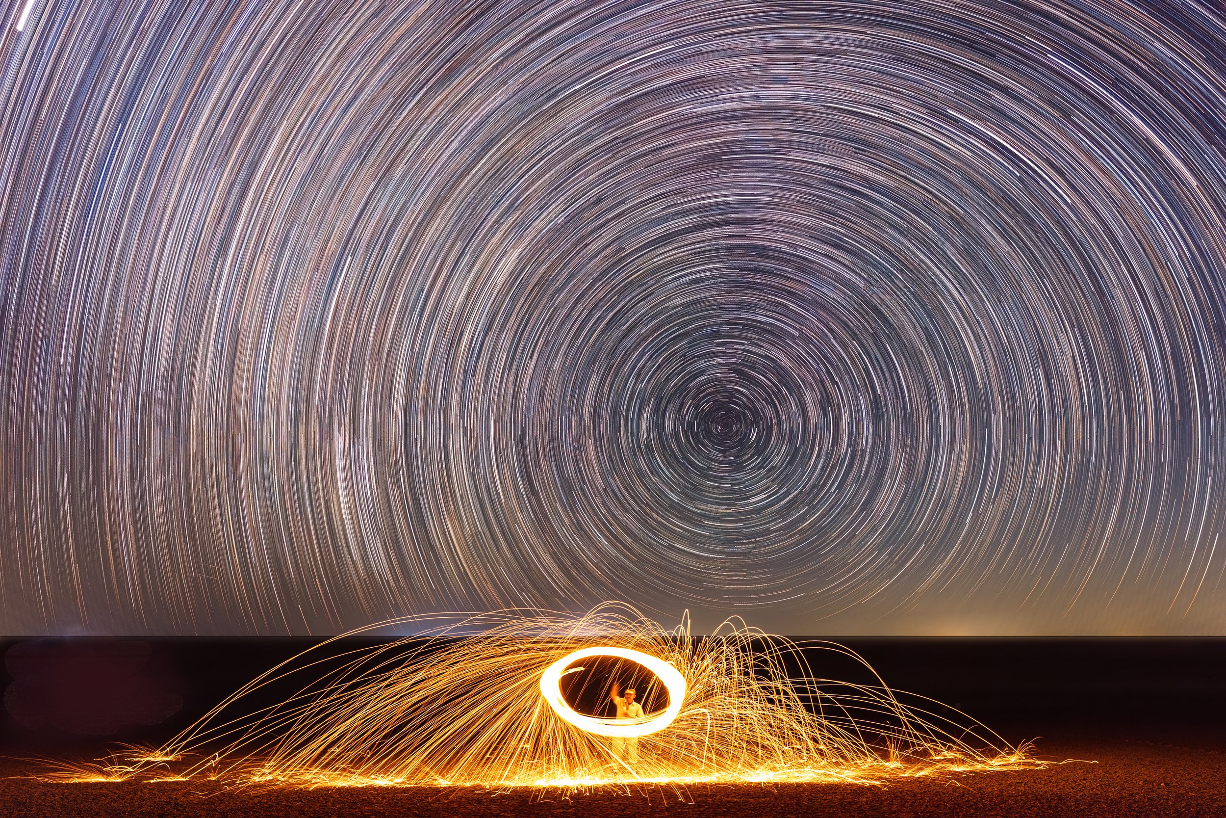 Description and Details: Created during a session of Milkyway Saga, this frame captures the silent motion of the night sky through star trails, with a moment of creative expression on Earth.