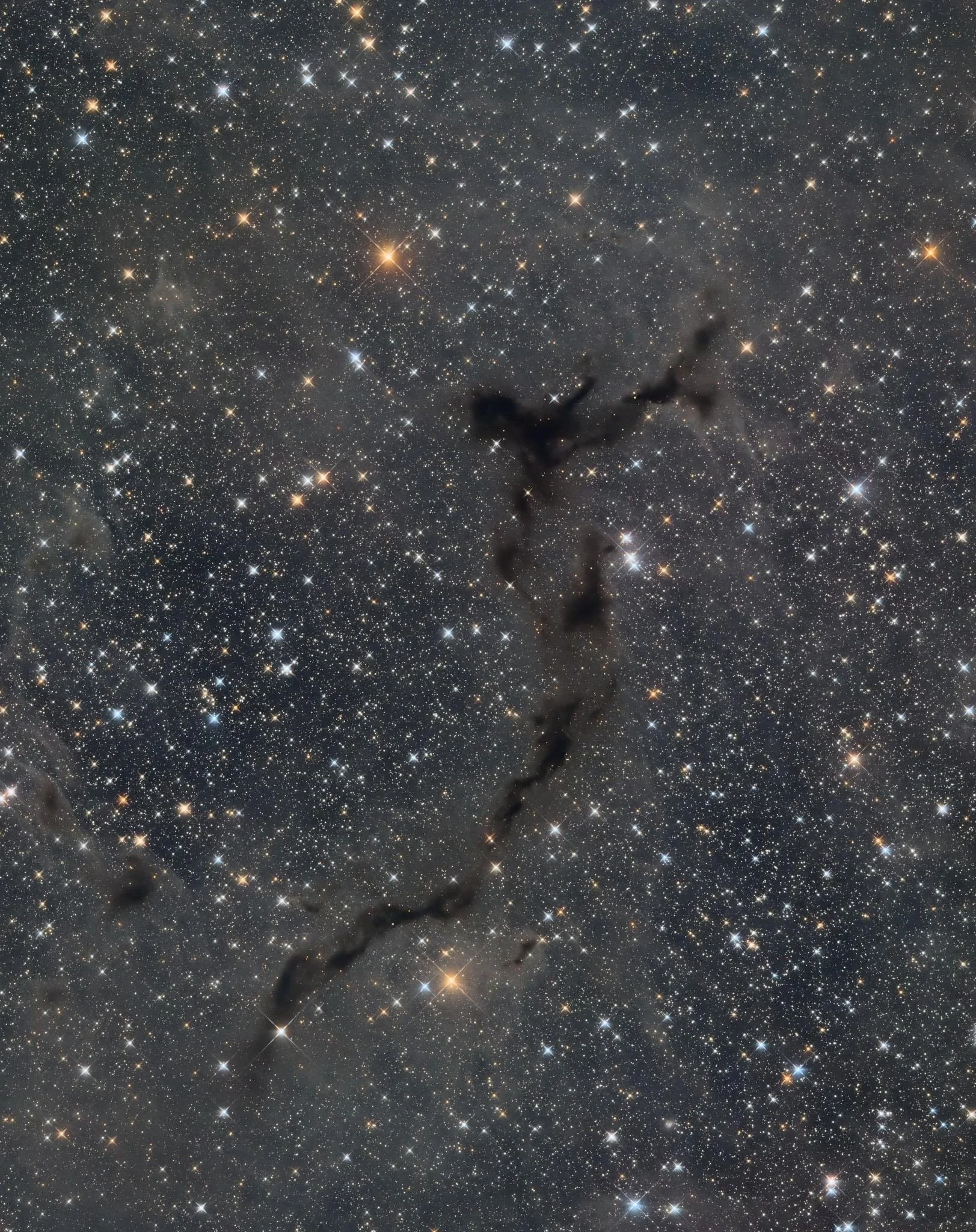 This is dark nebula located 1200 light years away. It is visible in the constellation Cepheus near the flying bag and the squid nebula.
